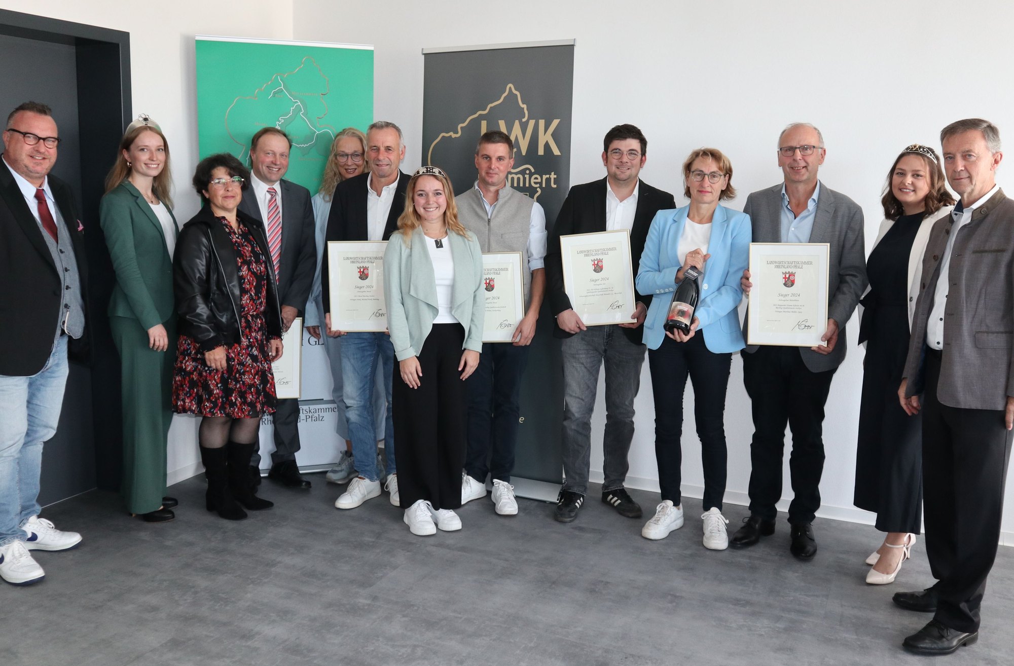 Es ist die Hitparade der Besten, die absoluten Nummer-1-Hits, auch Siegerweine oder Siegerbrände genannt: Im Rahmen der Preisverleihung für die Sieger 2024 ließ es sich Staatssekretär Andy Becht nicht nehmen und reiste an die Mosel. In der neuen Dienststelle der Landwirtschaftskammer in Bekond übergab er gemeinsam mit Weinbaupräsident Walter Clüsserath und den anwesenden Weinmajestäten Anna Zenz (Mosel), Annabell Stodden (Ahr) und Hannah Roos (Mittelrhein) den Betrieben die Urkunden für Ihre Siegerprodukte. Statt einer zentralen Veranstaltung in Mainz werden die Urkunden für die „Sieger unter den Goldenen“ in allen sechs rheinland-pfälzischen Anbaugebieten persönlich an die Erzeugerinnen und Erzeuger überreicht.