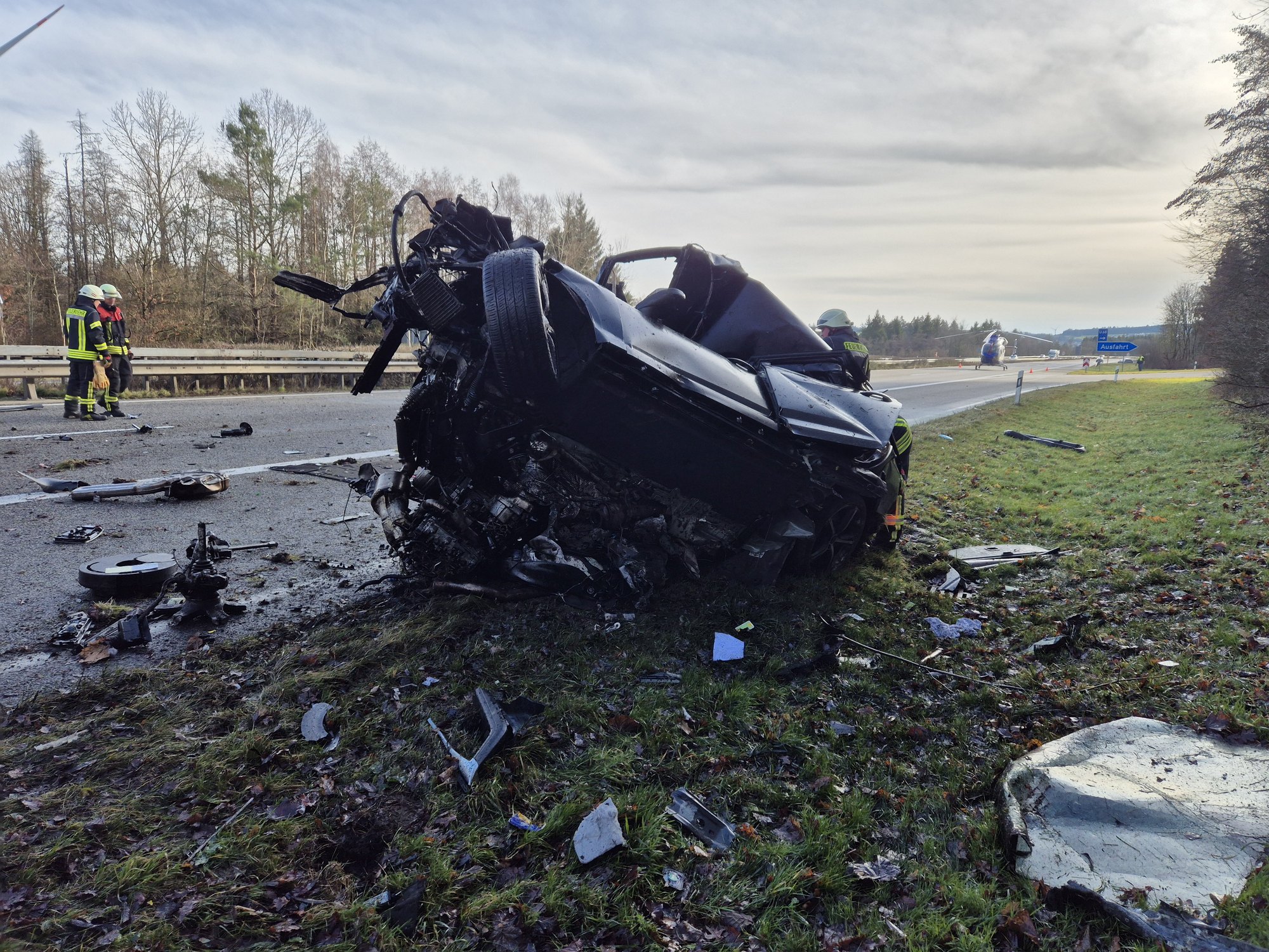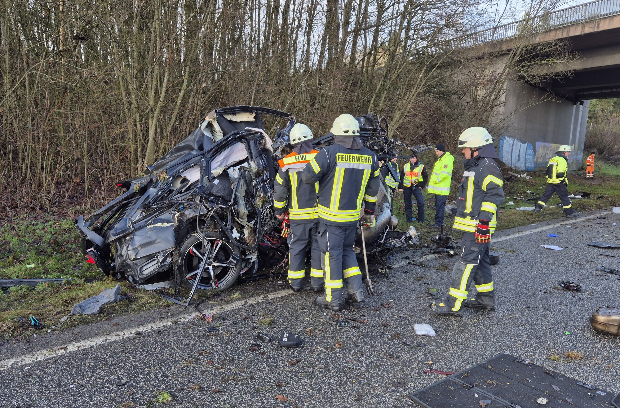 Der beteiligte BMW ist kaum noch als Fahrzeug zu erkennen. Der Motor liegt im Straßengraben, die Beifahrerseite ist vollständig eingedrückt.
