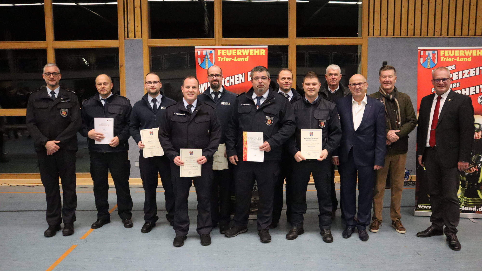 Die Beigeordneten Matthias Daleiden, Dieter Müller und Gerhard Schwarz sowie die stellvertretenden Wehrleiter Oliver Berg, Michael Trierweiler und Marco Schönhofen schlossen sich der Gratulation zur Auszeichnung an. Im Rahmen der Feierstunde wurden zudem mehrere Feuerwehrleute in Funktionen bestellt sowie nach erfolgter Ausbildung an der Feuerwehr- und Katastrophenschutzakademie Rheinland-Pfalz befördert: Marco Schönhofen: Bestellung zum 2. stellvertretenden Wehrleiter sowie Beförderung zum Hauptbrandmeister Robin Schneider: Bestellung zum Leiter der Feuerwehreinsatzzentrale Trier-Land Michael Sander: Bestellung zum stellv. Leiter der Feuerwehreinsatzzentrale Trier-Land Marvin Mares: Bestellung zum 2. stellv. Jugendfeuerwart der Feuerwehr Newel. Fabian Kreuzkamp, Gunnar Gremmler, Yannik Klucken: Bestellung und Vereidigung zur Wehrführung der fusionierten Feuerwehr Edingen-Godendorf sowie Beförderungen zum Oberbrandmeister. Eine besondere Ehrung erhielten die stellvertretenden Wehrleiter Michael Trierweiler und Marco Schönhofen. Aus den Händen des 1. Vorsitzenden des Kreisfeuerwehrverbandes Trier-Saarburg, Matthias Liesch, nahmen sie das Deutsche Feuerwehrehrenkreuz in Silber entgegen.