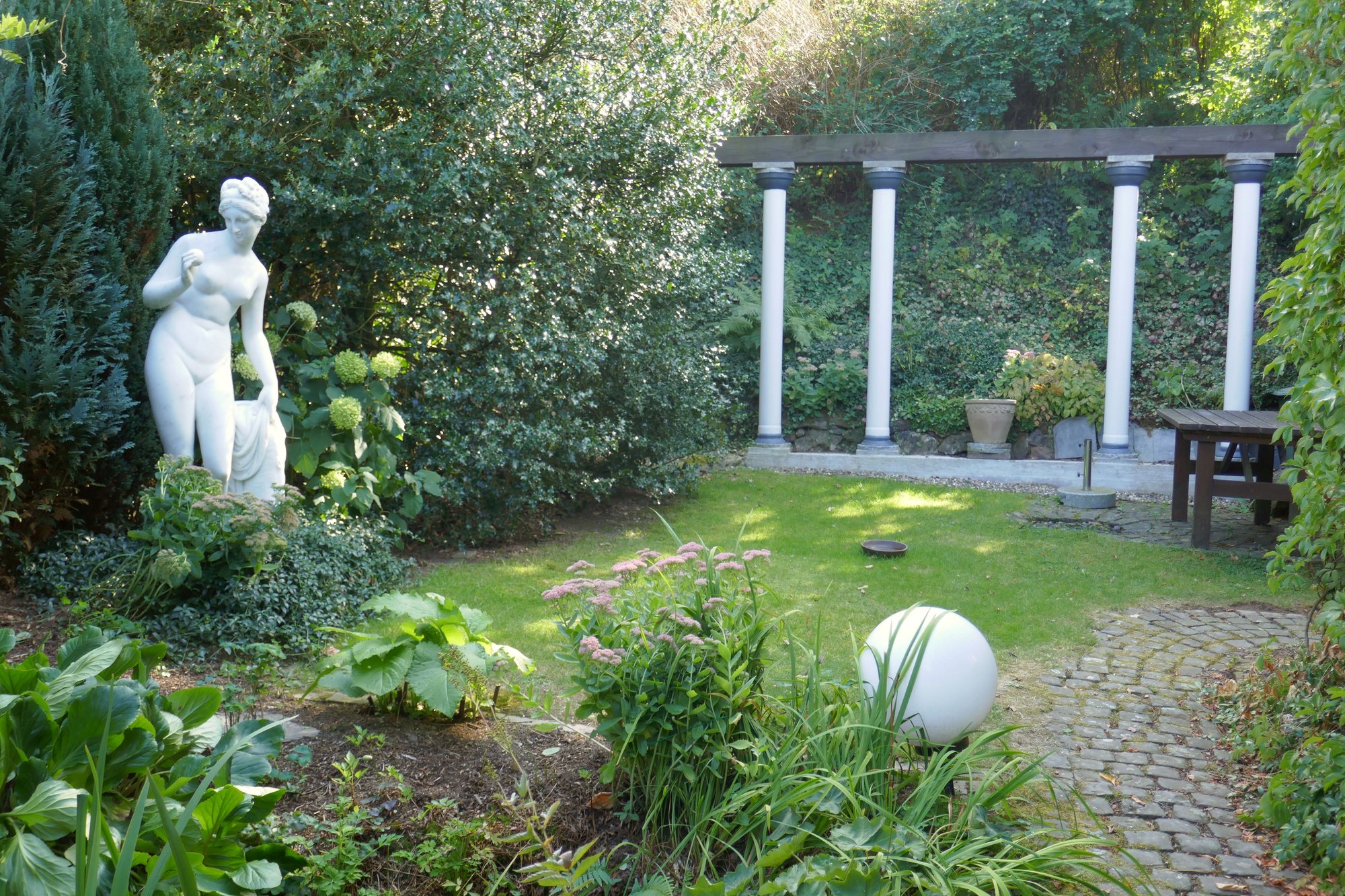 Zier- und Nutzgarten auf einer Fläche von ca. 1300 m². Landschaftsgestaltung mit Taunusquarzit, 2 Teiche, Moorbeet, Obstwiese, Spalierobst und Gemüsegarten. Auf der gesam ten Fläche gibt es eine große Pflanzenvielfalt. Die Bewirtschaftung ist rein biologisch mit Kompost, EM u. Terra Preta. Für Interessierte: Backofen (Eigenbau), Erdkeller und Brunnen (gebohrt).