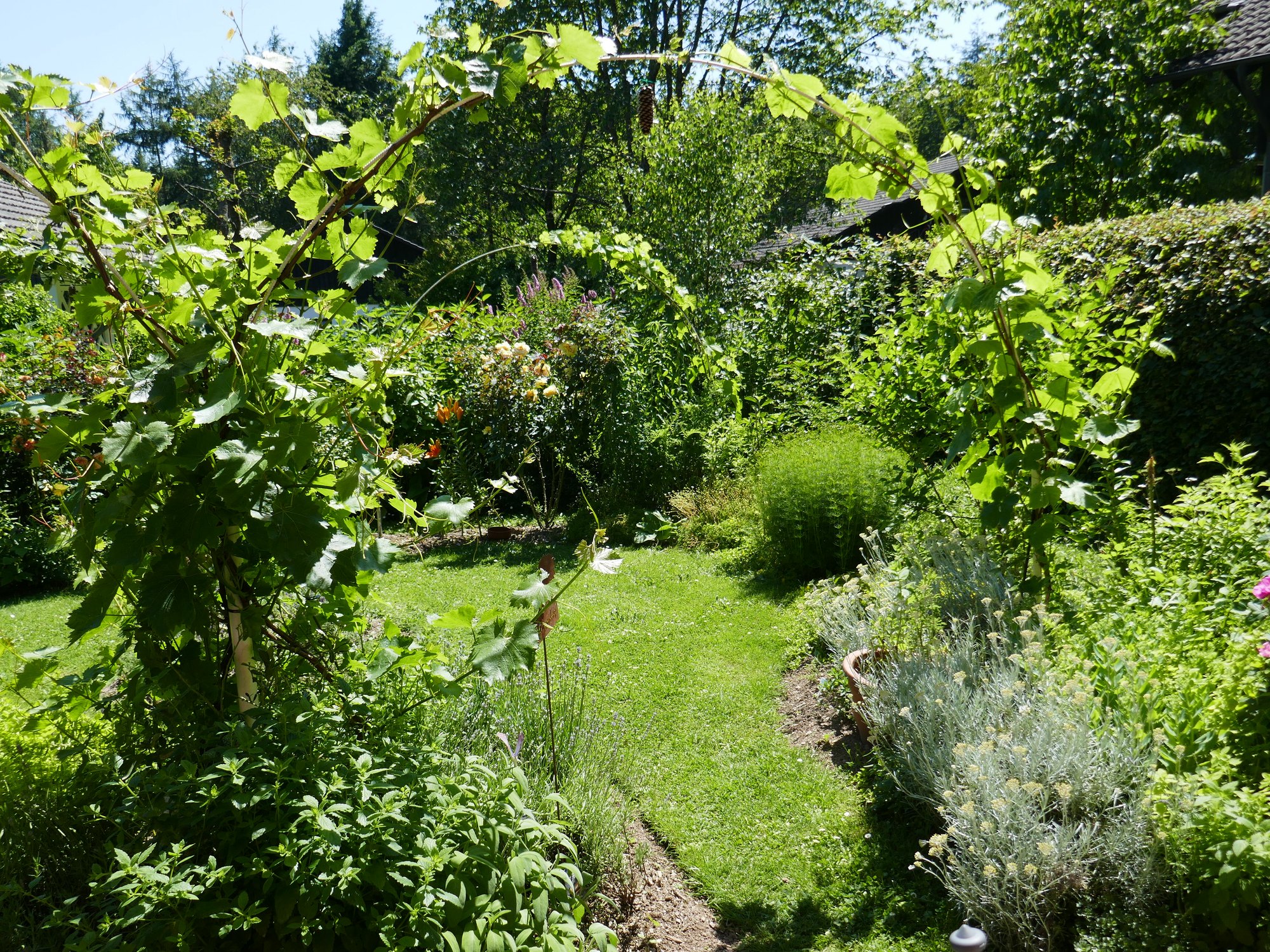 Typische Hunsrücker Haus-Umpflanzung; wild romantische Fassadenbegrünung am Haus mit zahlreichen Kletterpflanzen: Blauregen, Rosen, Kletterhortensie, Efeu, Wilder Wein, Klematis, Pfeifenwinde, Hopfen. Viele verschiedene Gemüse- und Kräutersorten im kleinen Garten. Eine Besonderheit ist der ganzjährig blühende gelbe Mohn. Der Atelierbesuch bei der Malerin und Bildhauerin ist eingeschlossen.