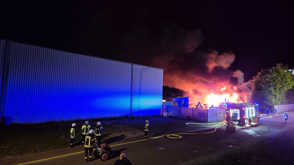 Das Feuer drohte zunächst auf benachbarte Hallen sowie ein angrenzendes Wohnhaus überzugreifen, was durch den schnellen und koordinierten Einsatz der Feuerwehr jedoch verhindert werden konnte. Die Löscharbeiten begannen umgehend - unter anderem mit einer Drehleiter aus der Luft, mehreren Trupps unter Atemschutz sowie einem Wasserwerfer.