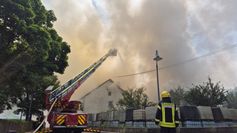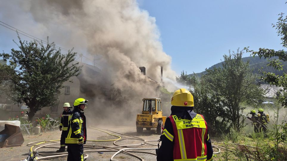Während der ersten Löschmaßnahmen kam es zu einer plötzlichen Durchzündung. Eine gewaltige schwarze Rauchsäule stieg in den Himmel, begleitet von meterhohen Flammen. Das Feuer griff auf das angrenzende Wohnhaus über. Die Brandbekämpfung erfolgte sowohl über die Drehleiter von oben als auch durch zahlreiche Löschtrupps am Boden. Die Arbeit der Feuerwehr wurde zusätzlich durch die extreme Außentemperatur von über 35 Grad erschwert.