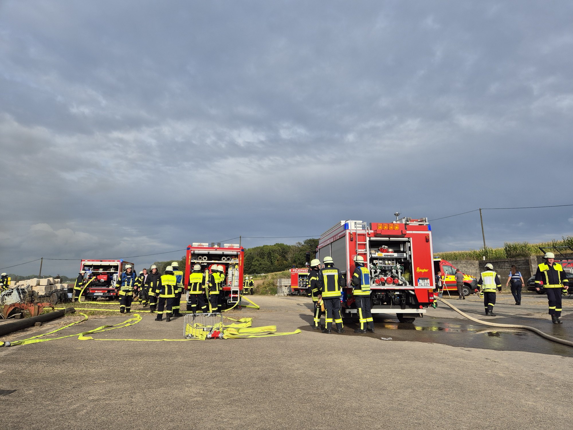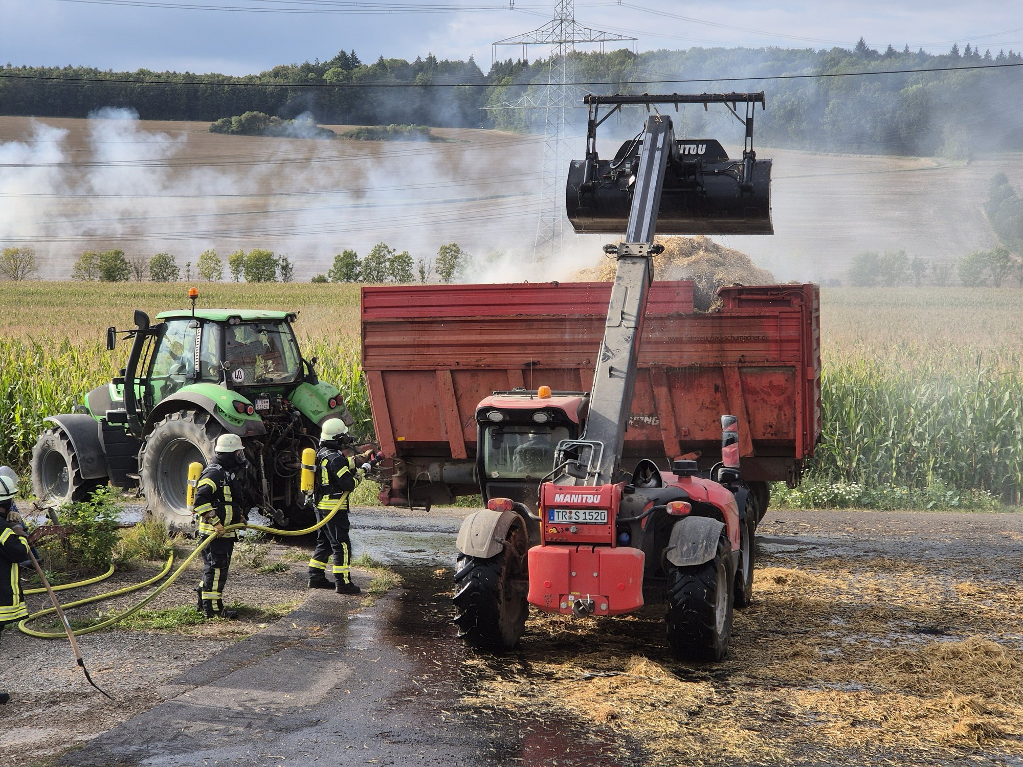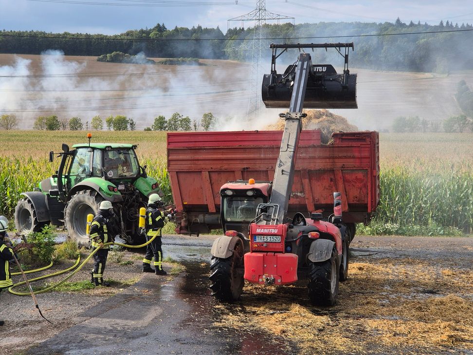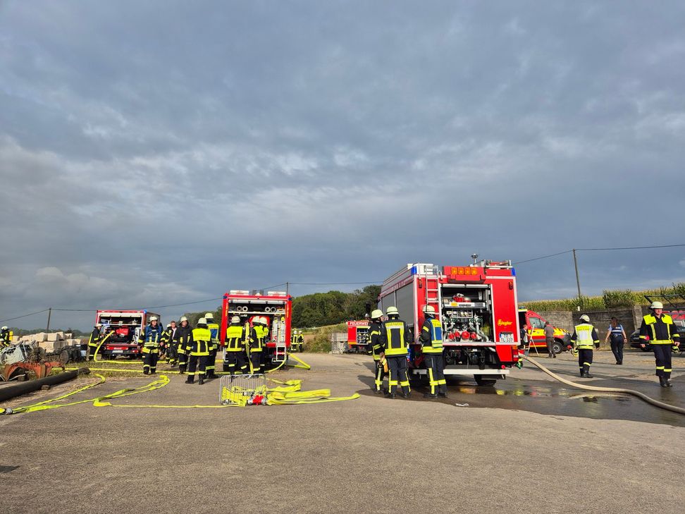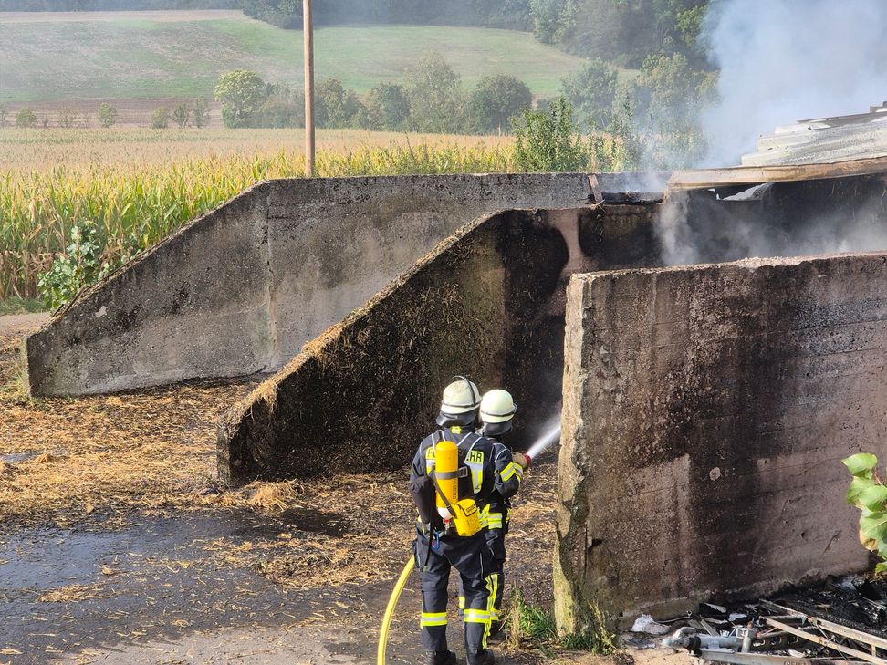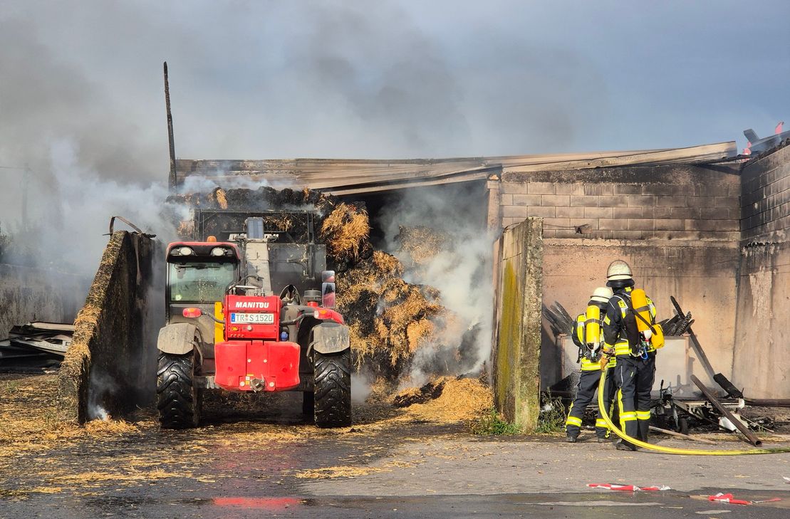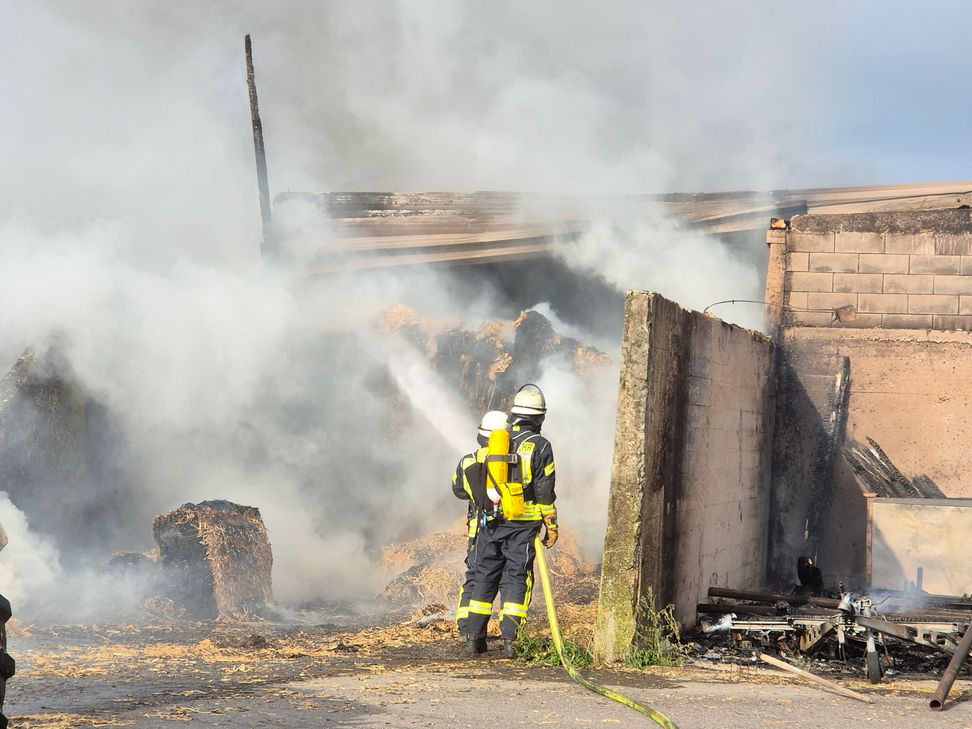Ein Wohnwagen brannte vollständig aus, ebenso mehrere landwirtschaftliche Geräte, darunter Bauteile eines Mähdreschers. Die etwa 50 Quaderballen wurden ebenfalls ein Raub der Flammen. Verletzte gab es glücklicherweise keine. Der Einsatz wurde vom Einsatzleitwagen der Feuerwehr vor Ort koordiniert.