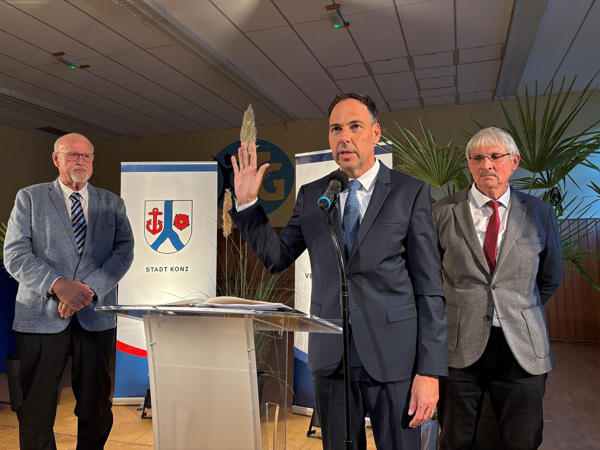 Im Anschluss wurde Guido Wacht offiziell in das Amt des Bürgermeisters eingeführt und verpflichtet. Bei der Wahl am Sonntag, 14. September, hatte er die Mehrheit der Stimmen erhalten: In der Verbandsgemeinde stimmten 71,4 Prozent der Wahlberechtigten für ihn, in der Stadt Konz 69,6 Prozent.