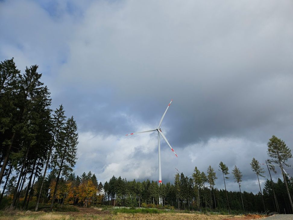 Wir waren am Dienstagmorgen in dem Wald, wo es den Einschlag gab, und wollten herausfinden, ob es Spuren unter anderem an einem Baum gibt. Es gibt einige frisch entwurzelte Bäume, aber hier wurden wir speziell nicht fündig. Bemerkten aber, dass in unmittelbarer Nähe ein Windrad des Windparks Gusenburg nicht ging. Vor Ort stellten wir fest, dass Mitarbeiter des betreffenden Windrads anwesend waren. Sie erklärten uns, dass es ziemlich genau zu der Uhrzeit des Gewitters eine Defektmeldung gab. Heute gegen 13:15 Uhr konnte das Windrad wieder den Betrieb aufnehmen. Einen direkten Einschlag gab es jedoch nicht, wohl eher in unmittelbarer Nähe, und die mögliche Erschütterung löste die Fehlermeldung aus, so der Vestas-Mitarbeiter.