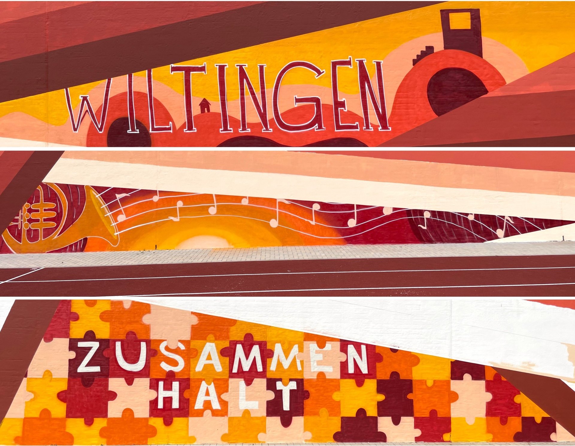 Ziel war es, jungen Menschen eine kreative Beteiligung an der Gestaltung ihres direkten Lebensumfelds zu ermöglichen? In gemeinsamen Gesprächen und kreativen Übungen wurden erste Skizzen erarbeitet und anschließend Motive zu Themen wie Heimat, Zusammenhalt, Kultur, Sport und Natur gemeinsam entwickelt und direkt an der rund 130 Meter langen Mauer in drei großformatigen Motiven künstlerisch umgesetzt – ein in dieser Form und Größe einzigartiges Kunstwerk innerhalb der Verbandsgemeinde.