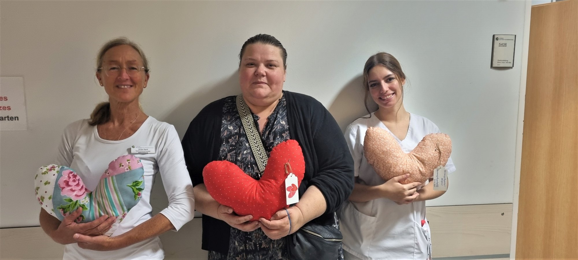 Diese Herzkissen hat die Leiterin der Außenstelle „Unteres Sauertal“ der Kreisvolkshochschule Ute Heidenz an das Brustzentrum des Klinikum Mutterhaus der Borromäerinnen in Trier übergeben.