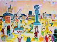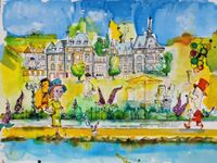 Grundheber beschreibt seine Werke als erzählerisch: „Meine Bilder enden nicht beim ersten Blick.“ Wer genauer hinschaut, entdeckt überraschende Details. In Trier etwa hat er den Marktplatz festgehalten – mit all seinen typischen Figuren. Doch wer genau hinsieht, bemerkt kleine ironische Elemente: Der heilige Petrus auf dem Marktplatzbrunnen ist Karl Marx gewichen, und eine Kirche greift mit einer riesigen Hand nach einem Haus. „Ich spiele mit Realität und Fantasie, um Geschichten zu erzählen“, sagt der Künstler.