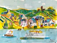 Auch in Neumagen-Dhron, wo das berühmte römische Weinschiff steht, bringt er Bewegung ins Bild: „In meinen Werken treibt fast immer eine Weinflasche vorbei – mal voll, mal leer. Manchmal hält eine Ente das Weinglas fest.“ Diese spielerische Symbolik zieht sich durch die gesamte Ausstellung.