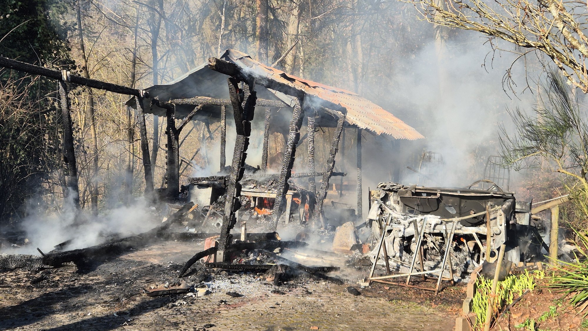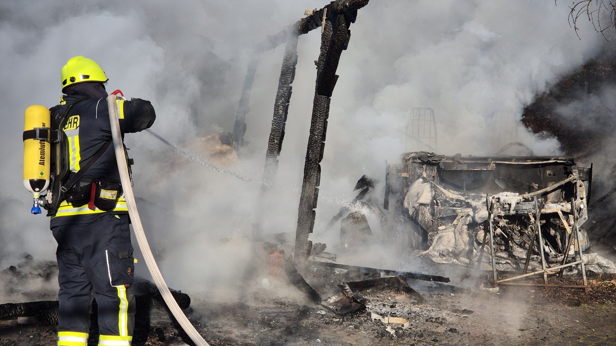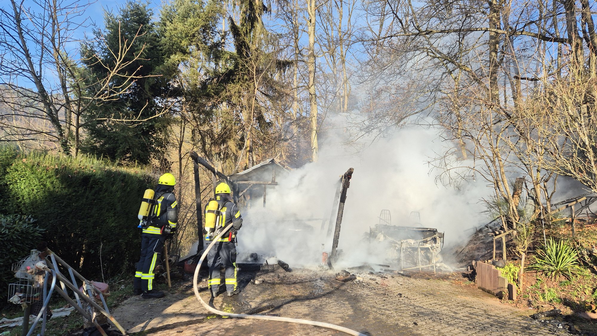 Aufgrund der abgelegenen Lage und des schwierigen Geländes konnten die Einsatzfahrzeuge der Feuerwehr nicht direkt bis zum Brandort vordringen. Eine längere Schlauchleitung musste bergauf verlegt werden, um die Löscharbeiten zu ermöglichen. Die weithin sichtbare schwarze Rauchsäule wies den Einsatzkräften den Weg. Mit Tanklöschfahrzeugen und einem Abrollbehälter mit 10.000 Litern Wasser wurde die Brandbekämpfung aufgenommen. Unter Atemschutz waren drei Trupps im Einsatz, um das Feuer zu löschen. Eine leere Gasflasche wurde gesichert. Glücklicherweise gab es keine Verletzten. Die Brandursache ist derzeit noch nicht bekannt.