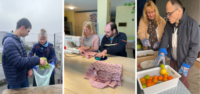 Für die Nutzer der Lebensmittelschränke gibt es in der Weihnachtszeit kleine festliche Spezialitäten, die schön verpackt werden. Auch hier helfen die Lebenshilfe-Betreuten: Die Taschen und Tüten für die Verpackung werden von ihren fleißigen Händen hergestellt. Die Materialien wurden gespendet. Die Betreuten und Mitarbeitenden erklären, dass sie es toll finden, anderen eine Freude bereiten zu können.