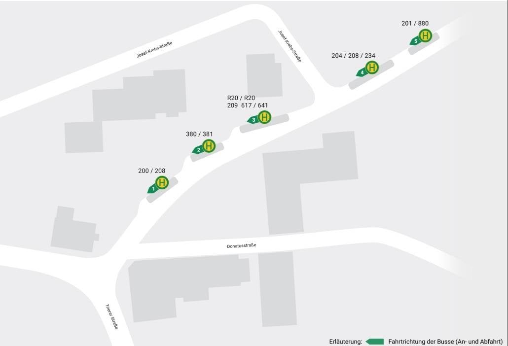 Die Bussteige befinden sich künftig nicht mehr direkt auf dem Donatusplatz, sondern in fünf Haltebuchten am Rand der St.-Josef-Straße. Welche Linie an welchem Steig abfährt, ist in einem Übersichtsplan des Verkehrsverbunds festgelegt, der auch online abrufbar ist. Die Neuordnung berücksichtigt zudem zusätzliche Buslinien, die während der Bauzeit hinzugekommen sind.