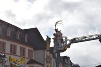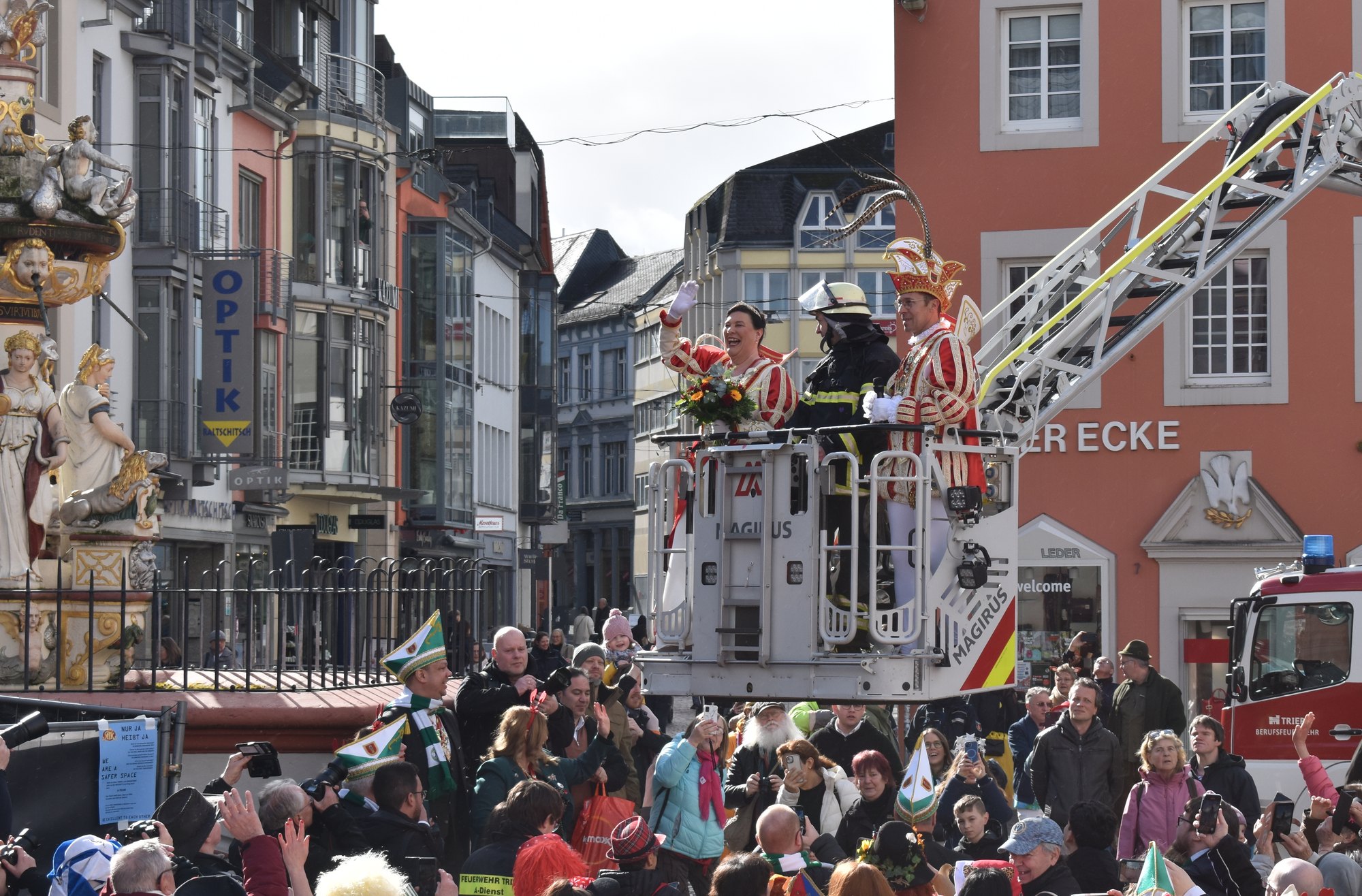 Pünktlich um 11.11 Uhr nach der Erstürmung des Rathauses erreichte das Prinzenpaar der Stadt Trier, Christine II. und Stephan I. von Euranien, mit seinem Hofstaat den Hauptmarkt. Traditionell übergaben die beiden Tollitäten Stadtpatron Petrus einen Orden und einen Blumenstrauß und verkündeten die närrischen Gesetze.