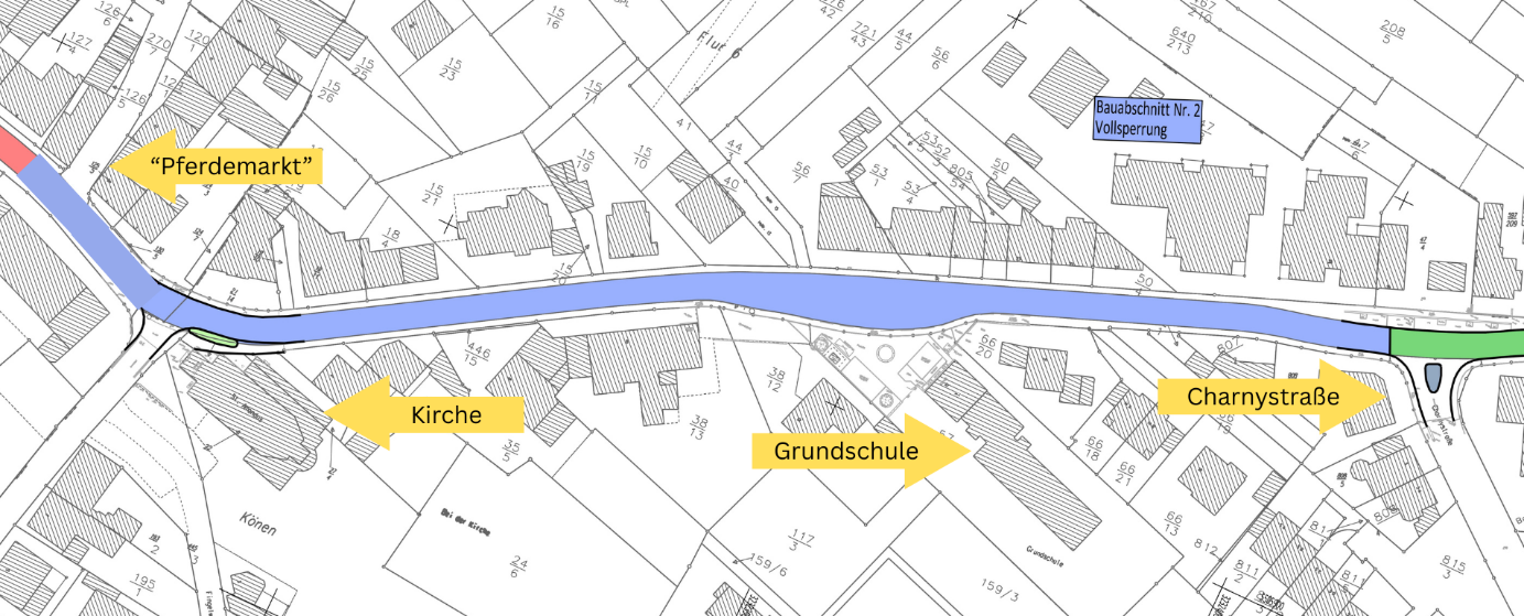 Für die Dauer der Sanierung wird die Straße in diesem Abschnitt voll gesperrt. Das betrifft auch die Abzweigung Pferdemarkt, die im 1. Bauabschnitt noch nutzbar war. Die Zufahrt zur Charnystraße und damit zur Kita, zur Schule und zum Bürgerhaus, bleibt aus Richtung Konz kommend möglich.