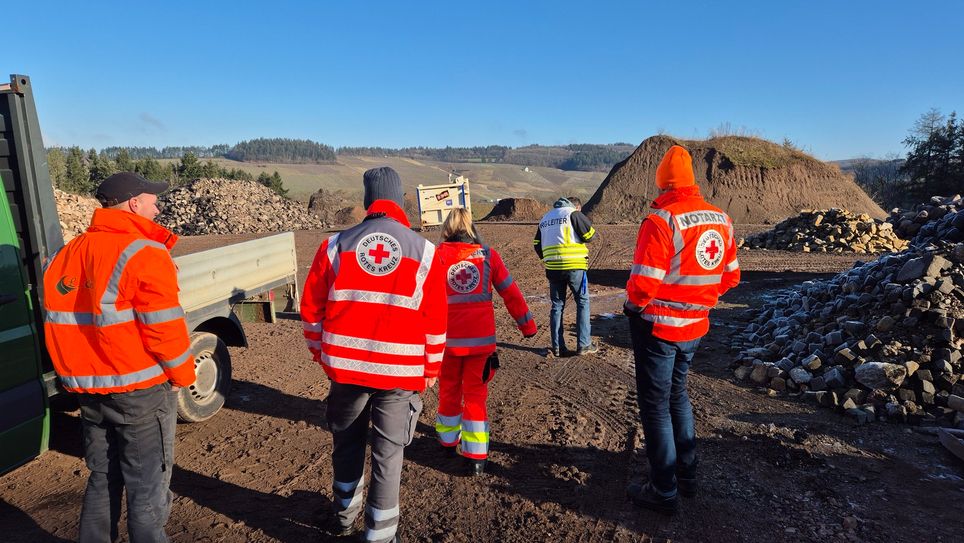 Währenddessen brachten sich die Polizeikräfte hinter einem Erdwall in Sicherheit, während die Mitarbeiter des Bauunternehmens und das DRK sich in sicherer Entfernung aufhielten.