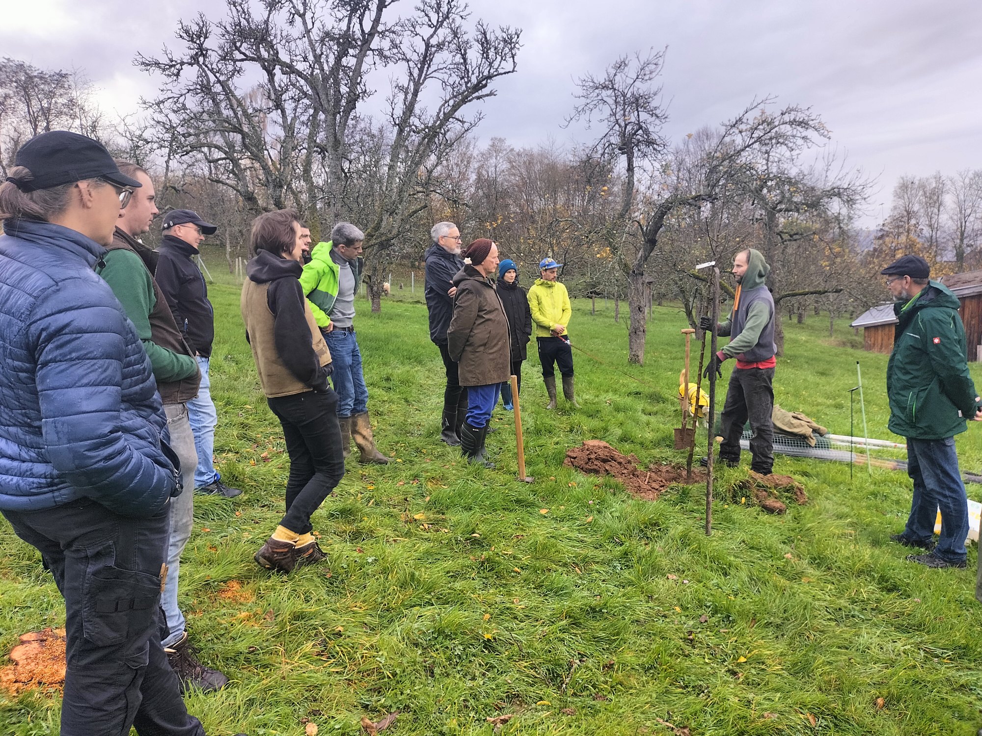 Zudem gab er viele praktische Einblicke aus seiner langjährigen Tätigkeit und ging dabei auch auf die konkreten Fragen der Teilnehmenden ein. Am Nachmittag wurde gemeinsam ein Apfelbaum auf dem Gelände des Freilichtmuseums Roscheider Hof in Konz gepflanzt. Dabei erklärte Johannes Haide die einzelnen Schritte, damit der Baum gut anwachsen kann.