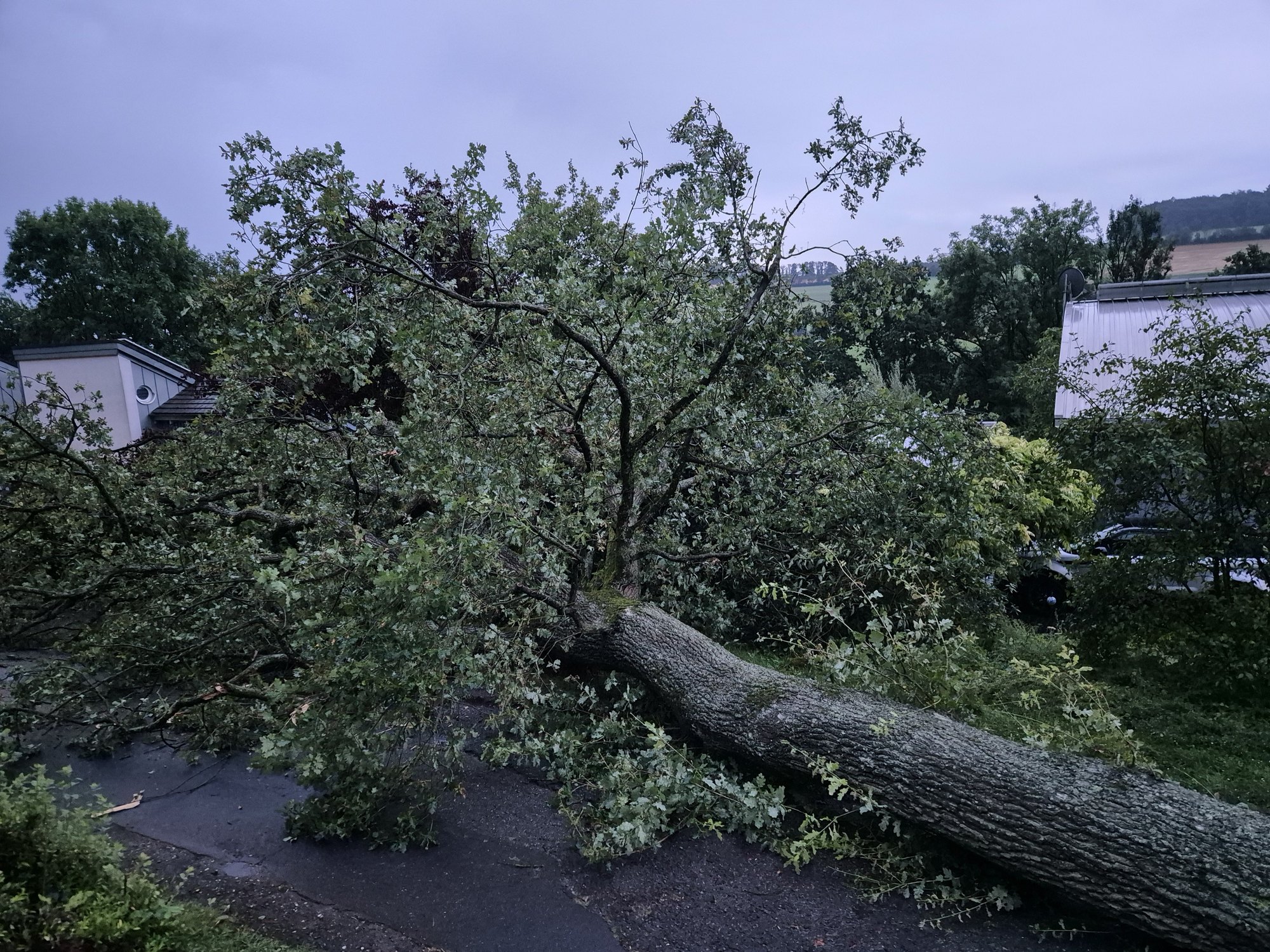 Den folgenschwersten Einsatz gab auch nach dem Durchzug der Unwetterfront in Butzweiler. Hier wurde die Feuerwehr in die Straße „Am Kestenberg“ gerufen. Dort ist eine stattliche Eiche durch eine starke Sturmböe entwurzelt worden und stürzte über die Straße auf eine Garage. Die beiden Bewohner des betroffenen Anwesens berichten: „Der Wind war nur wenige Minuten, aber sehr heftig. Dann haben wir den Baum schon stark wackeln gesehen und schon war es passiert. Wir hatten soviel Glück, dass er unser Wohnhaus verfehlt hatte und somit auf die Garage gestürzt ist. Dann haben wir die Feuerwehr gerufen.“ Diese rückte an und stellte fest, dass der Baum auch tatsächlich beseitigt werden musste, da die Straße eine Sackgasse ist und bei einen Notfall, man die Häuser im hinteren Bereich nicht erreichen würde. Doch so einfach war es nicht den Baum wegzuschneiden.