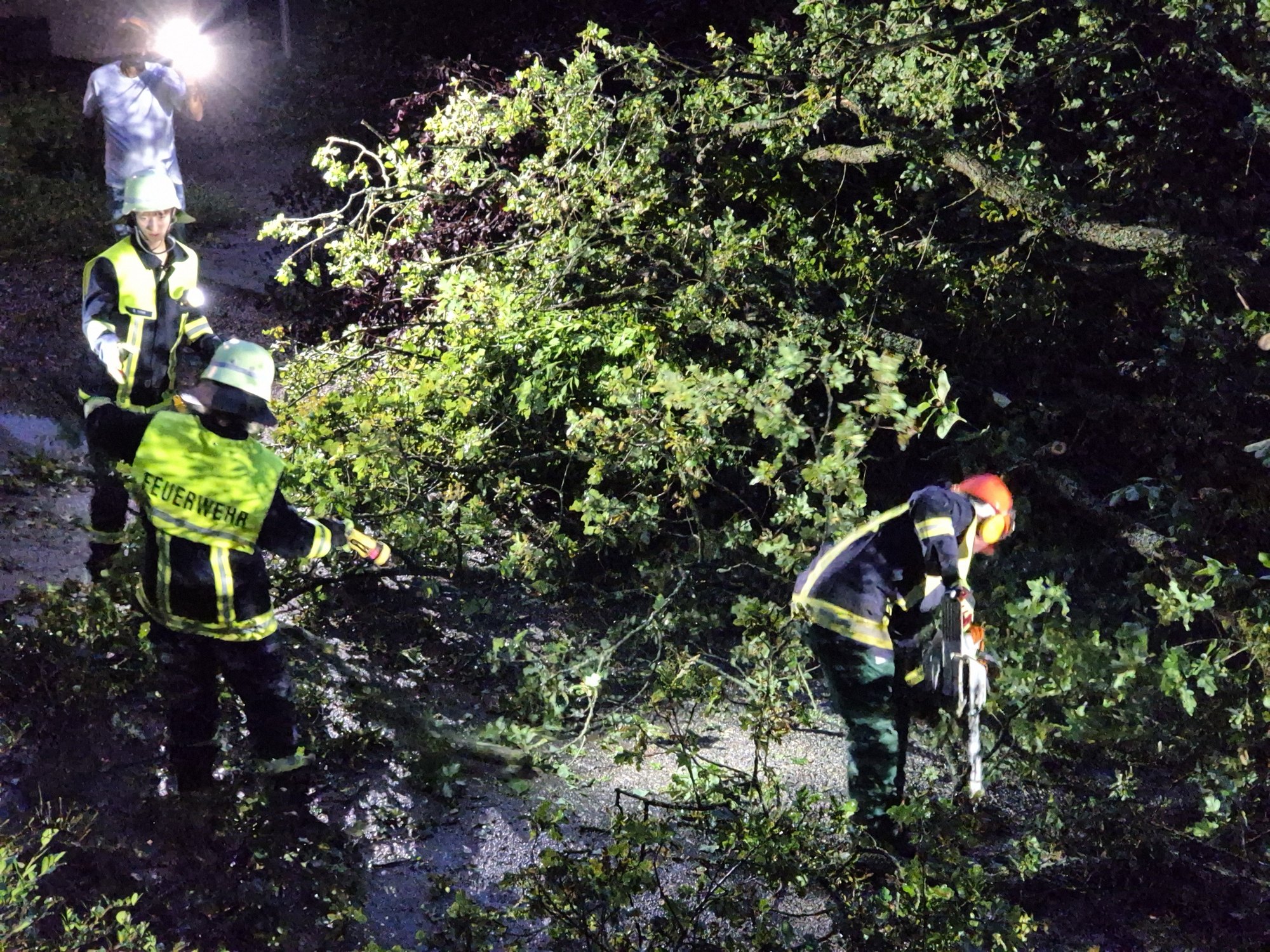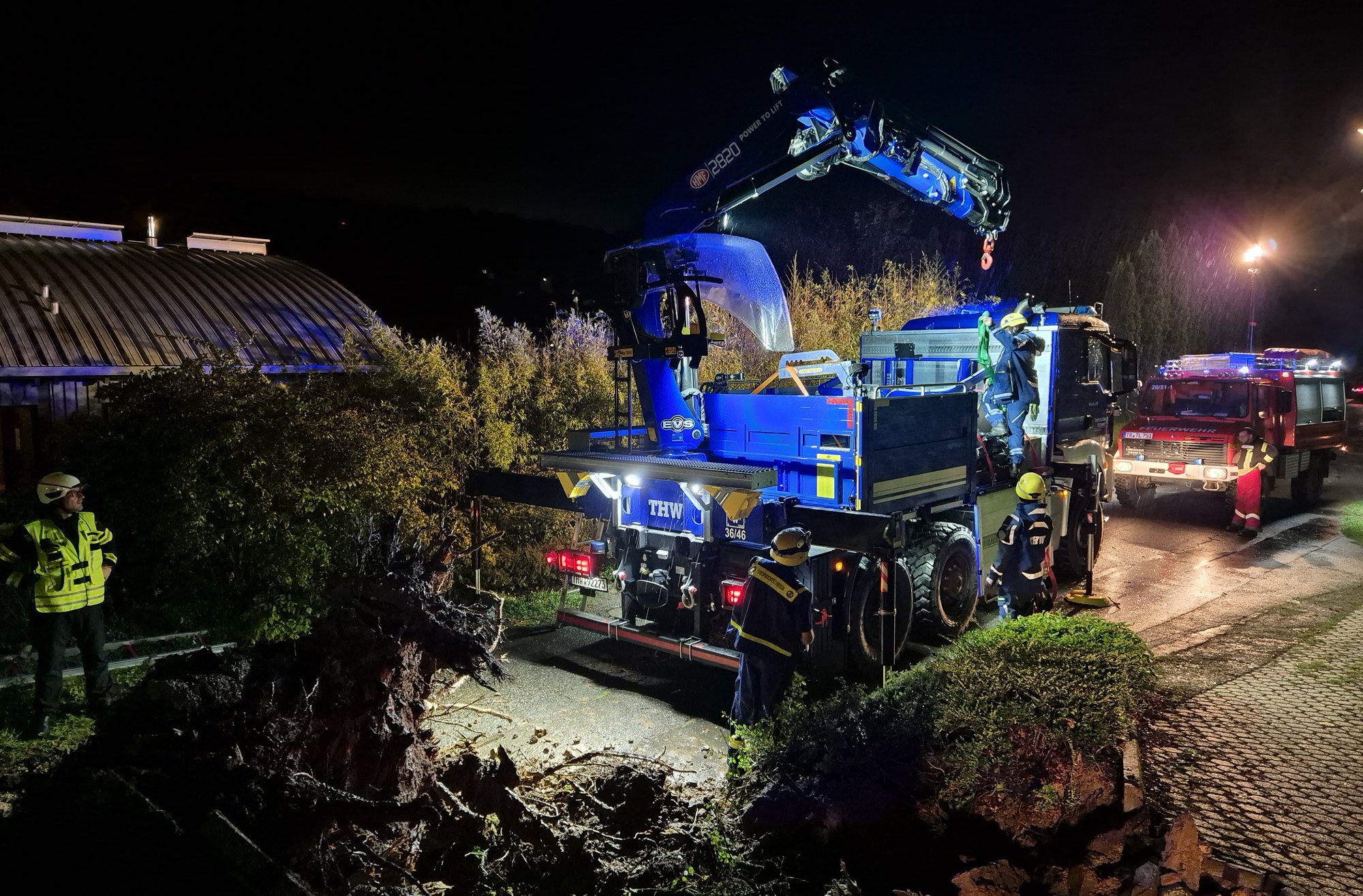 Zur späten Stunde ist dann das THW mit einem Kran- Lastwagen angerückt. Mit diesem konnte der Stamm nach und nach angehoben und zersägt werden. In mühevoller und stundenlanger Arbeit konnte der Einsatz nach 5 Stunden am Sonntagmorgen um 1 Uhr beendet werden. Verletzt wurde glücklicherweise niemand.