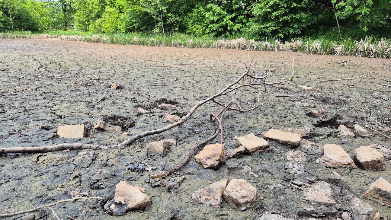 Statt spiegelnder Wasserfläche herrscht jetzt rissiger Schlamm, durchzogen von ersten Wasserpflanzen – von Fischen fehlt jede Spur. Der Zufluss und Ablauf liegen trocken, selbst der Regen am Wochenende konnte daran nichts ändern.