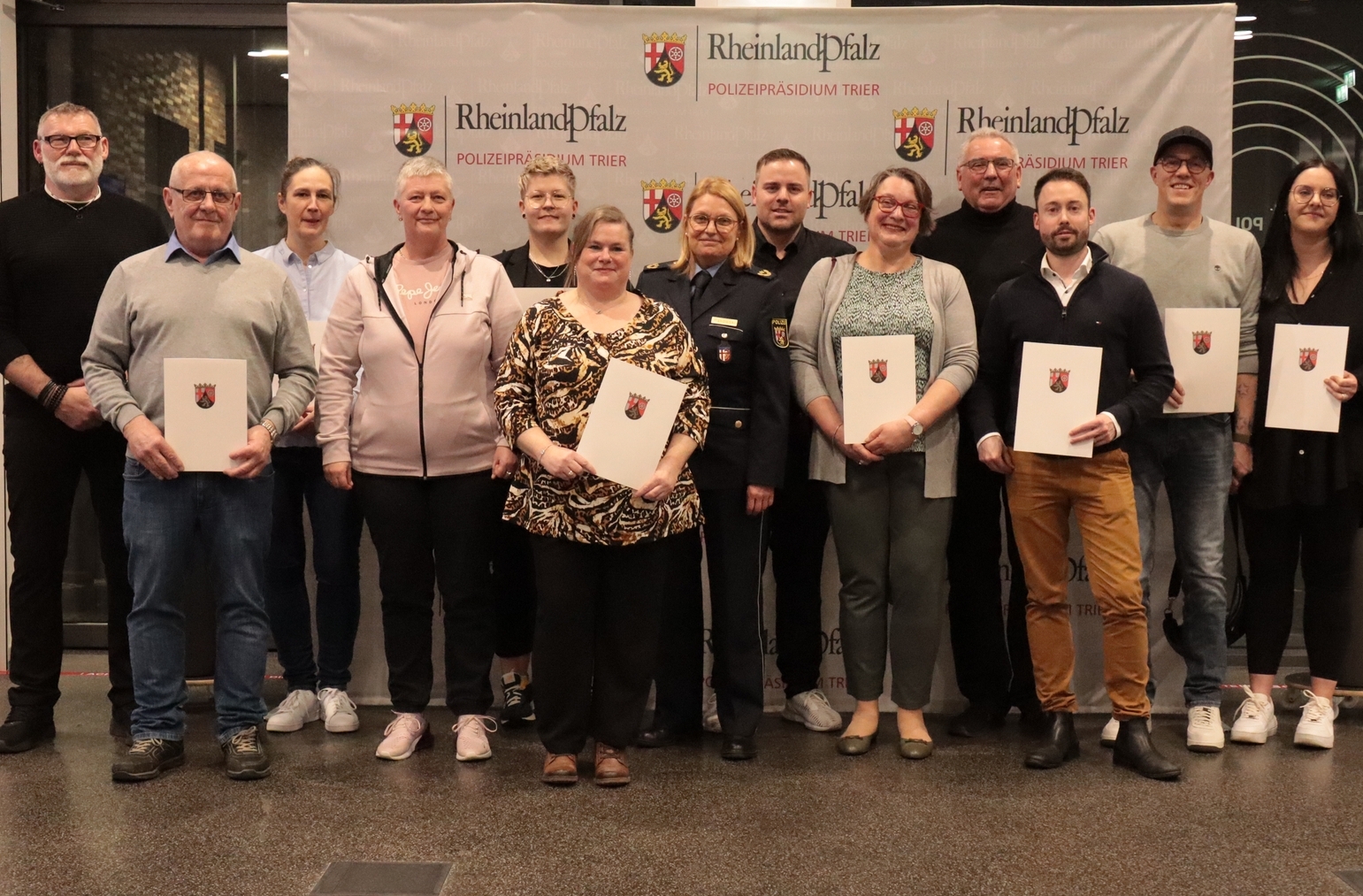 Die Behördenleiterin des Polizeipräsidium Trier, Anja Rakowski, hat am Mittwoch, den 21. Februar, Bürgerinnen und Bürger geehrt, die ganz im Sinne der Kampagne "Wer nichts tut, macht mit" ein hohes Maß an Zivilcourage gezeigt, Menschen gerettet oder maßgeblich zur Aufklärung von Straftaten beigetragen haben. 18 Bürgerinnen und Bürger erschienen zur Feierstunde im Polizeipräsidium Trier.