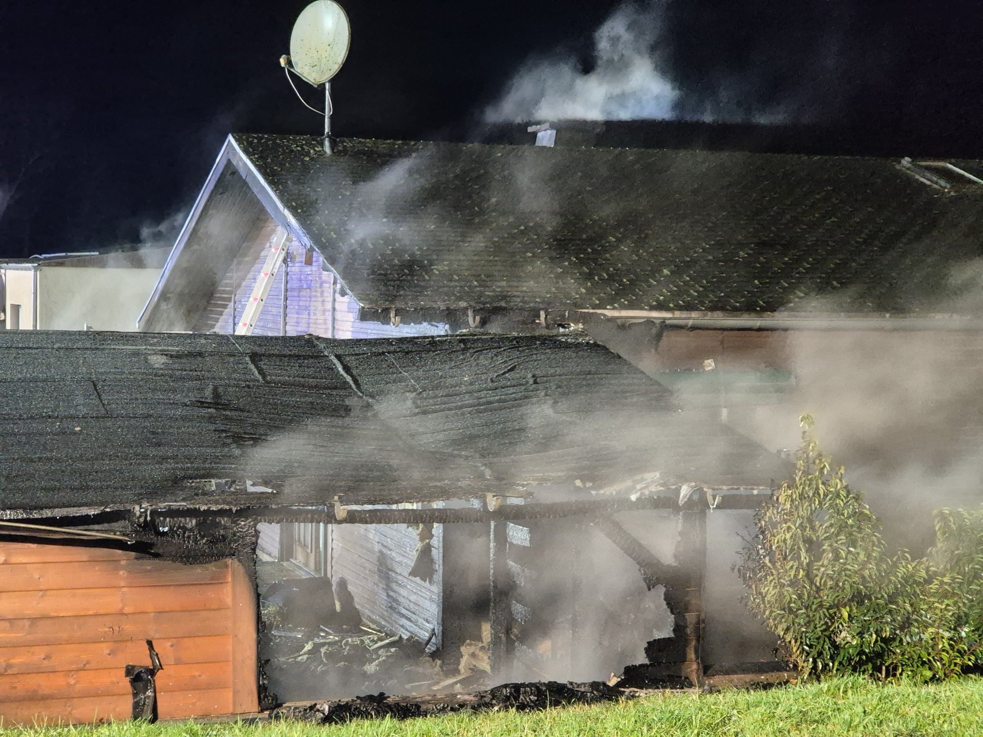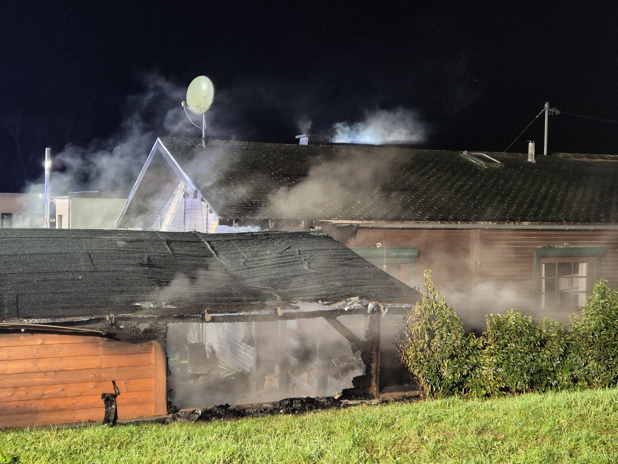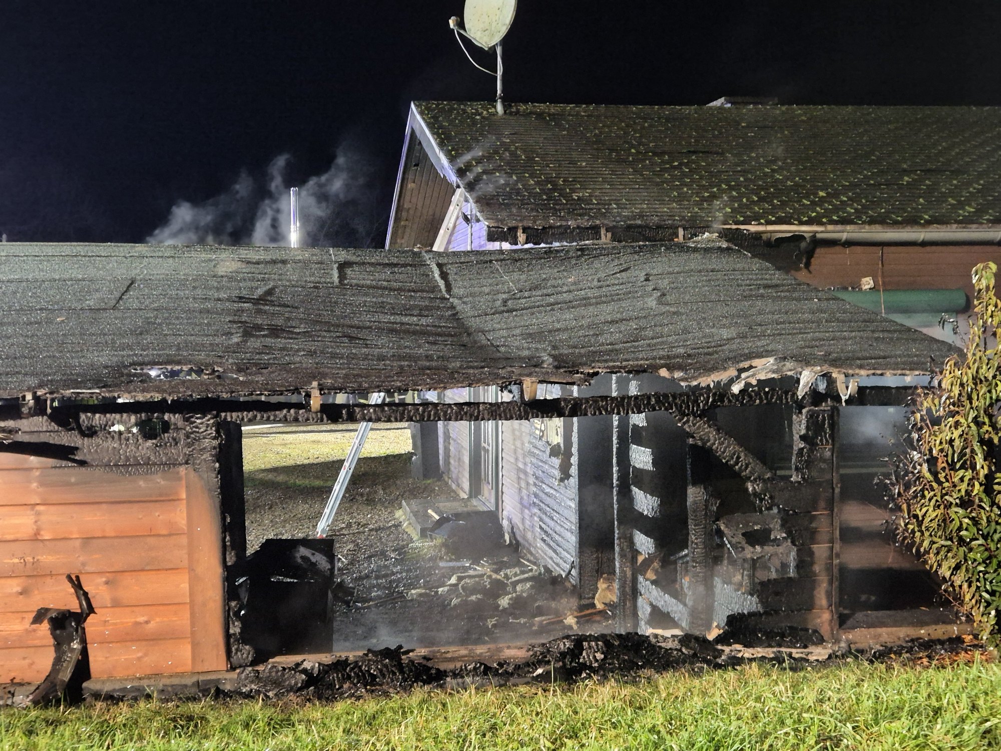 Die Flammen griffen in der Folge auf das Wohnhaus – ein Holzhaus – über. Die beiden Bewohner konnten das Gebäude selbstständig verlassen und wurden vor Ort vom Rettungsdienst ambulant behandelt. Sie erlitten leichte Rauchgasverletzungen, ein Transport ins Krankenhaus war jedoch nicht erforderlich.