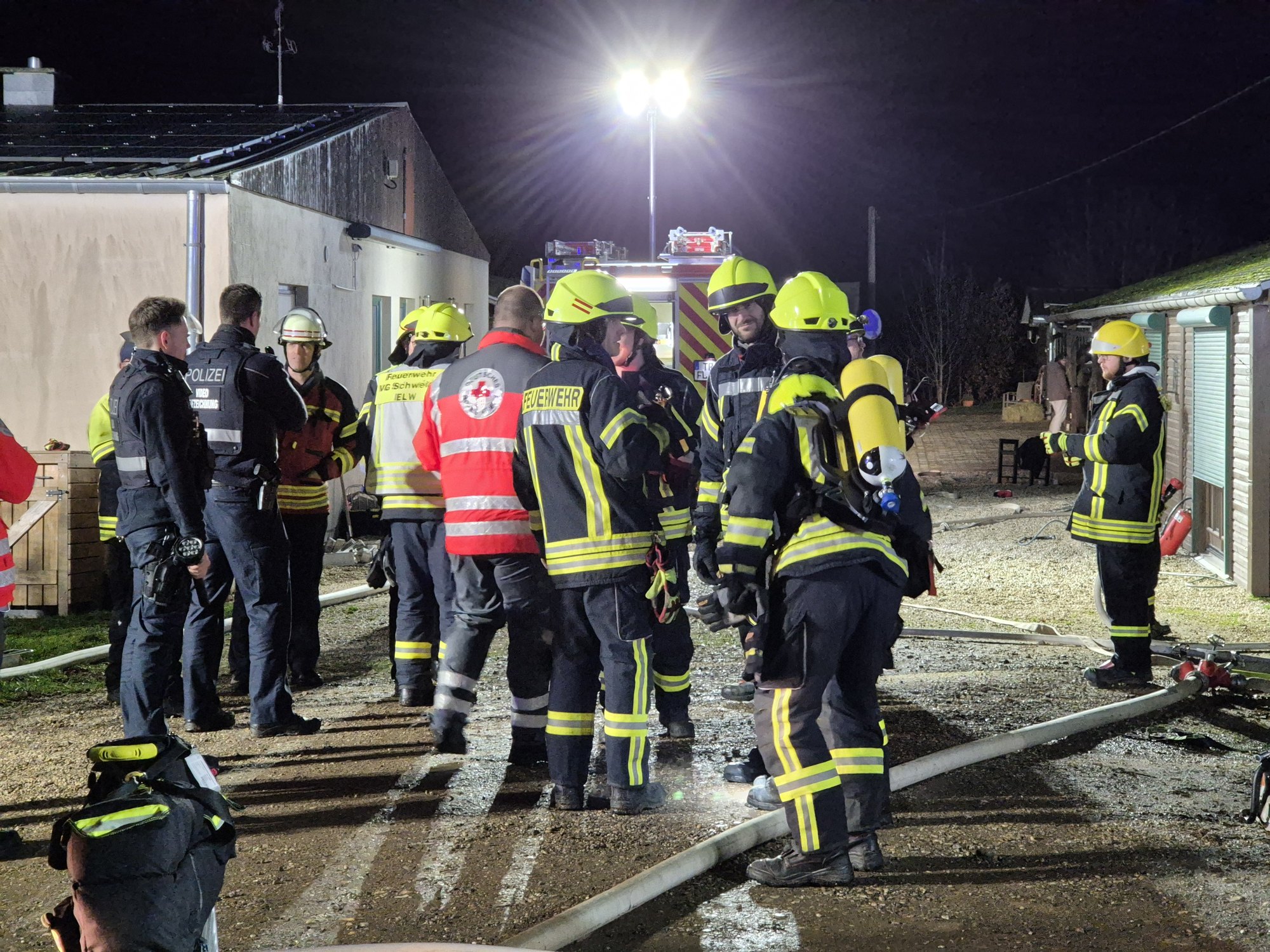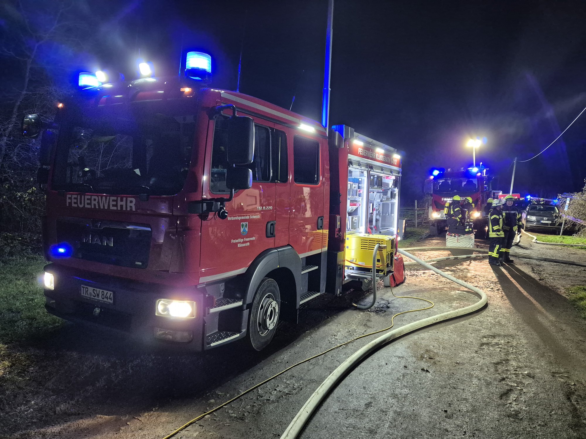 Im Großeinsatz waren über 110 Einsatzkräfte, darunter die FEZ, Wehrleitung und Führungsstaffel der VG Schweich, die Feuerwehren aus Ensch, Klüsserath, Leiwen, Schleich und Schweich, der BKI und stellvertretende BKI des Landkreises Trier-Saarburg sowie das DRK Schweich, der Notarzt aus Ehrang, der DRK OV Schweich und die Polizei aus Schweich und Trier.