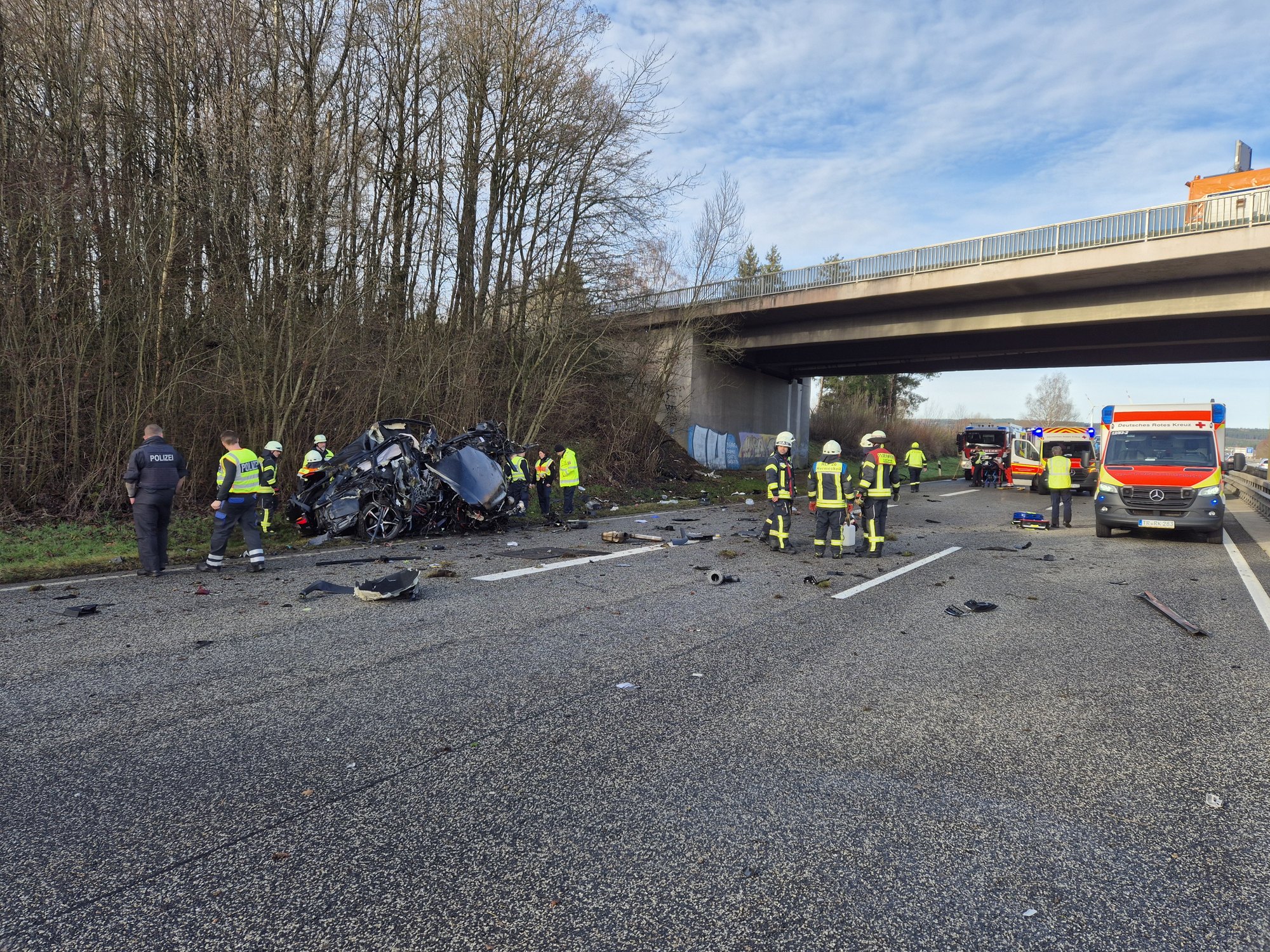 Großes Trümmerfeld und kilometerlanger Rückstau„Als wir an der Einsatzstelle angekommen waren, bot sich uns ein riesiges Trümmerfeld. Wir sicherten die Unfallstelle ab und stellten den Brandschutz sicher“, erklärte Daniel Bredel, Einsatzleiter der Feuerwehr vor Ort. Gleichzeitig lobte er die vorbildlich gebildete Rettungsgasse.