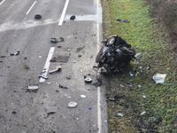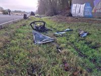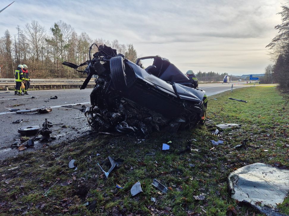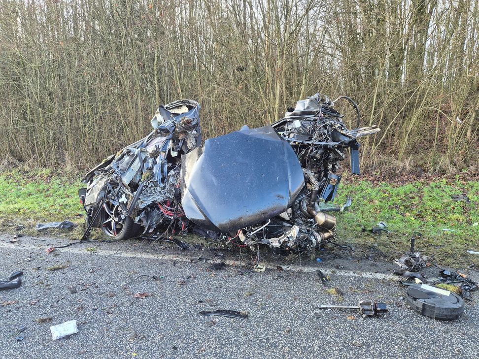 Der beteiligte BMW ist kaum noch als Fahrzeug zu erkennen. Der Motor liegt im Straßengraben, die Beifahrerseite ist vollständig eingedrückt.