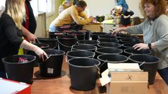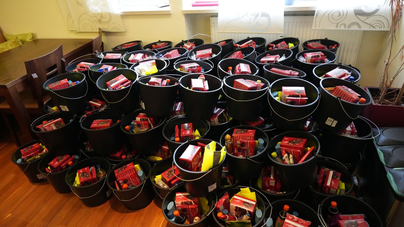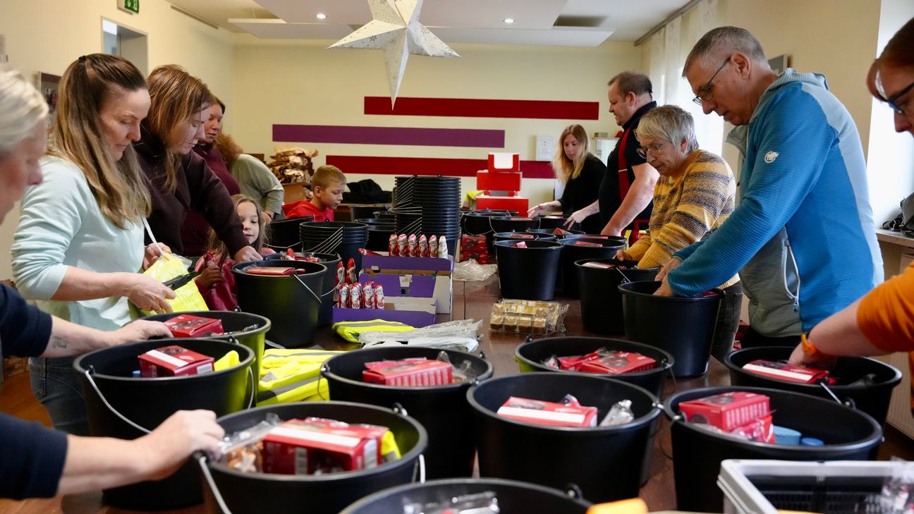 Ab 11 Uhr trafen sich die Helferinnen und Helfer im Mehrgenerationenhaus. Zunächst wurden die angelieferten Spenden aus Fahrzeugen und Anhängern entladen. Anschließend begann die eigentliche Packaktion, die klar strukturiert war. Auf einem großen Tisch wurden die Spenden wie an einem Fließband sortiert. Ursprünglich habe man geplant, Geschenktüten zu packen, doch Blaes habe sich kurzfristig für Eimer entschieden, da diese mehr Platz boten und robuster seien.