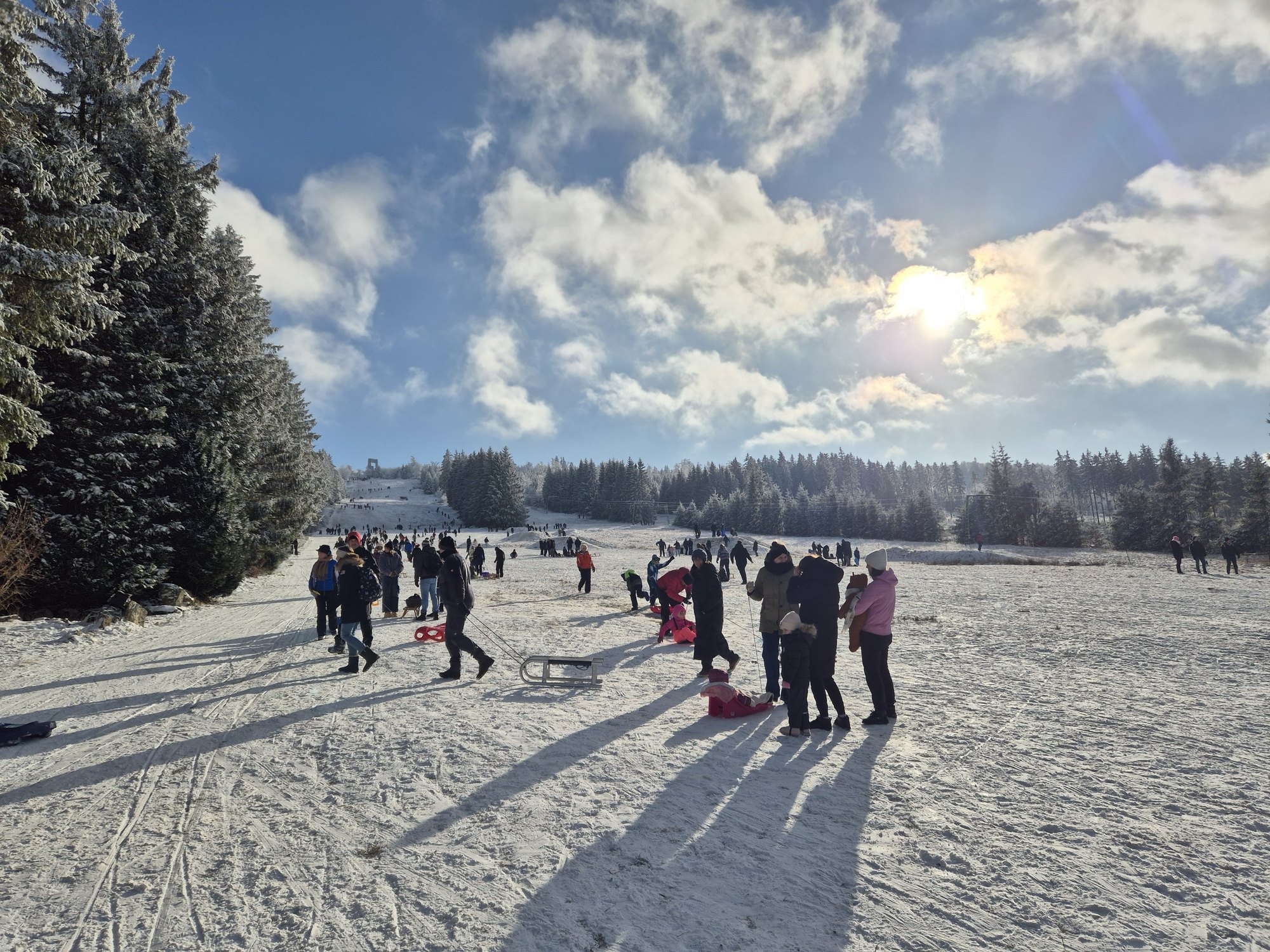 Am Sonntag zeigte sich der Winter dann von seiner besten Seite: Sonne und Wolken bei knackigen minus fünf Grad sorgten für ideale Bedingungen. Der Besucheransturm nahm nochmals deutlich zu – mehrere Tausend Menschen kamen an den Erbeskopf. Ein Blick auf die Parkplätze zeigte Kennzeichen aus ganz Rheinland-Pfalz, dem Saarland sowie aus Luxemburg, Belgien, den Niederlanden und Frankreich. Das Ziel war für alle gleich: Winterwandern und Schlittenfahren.