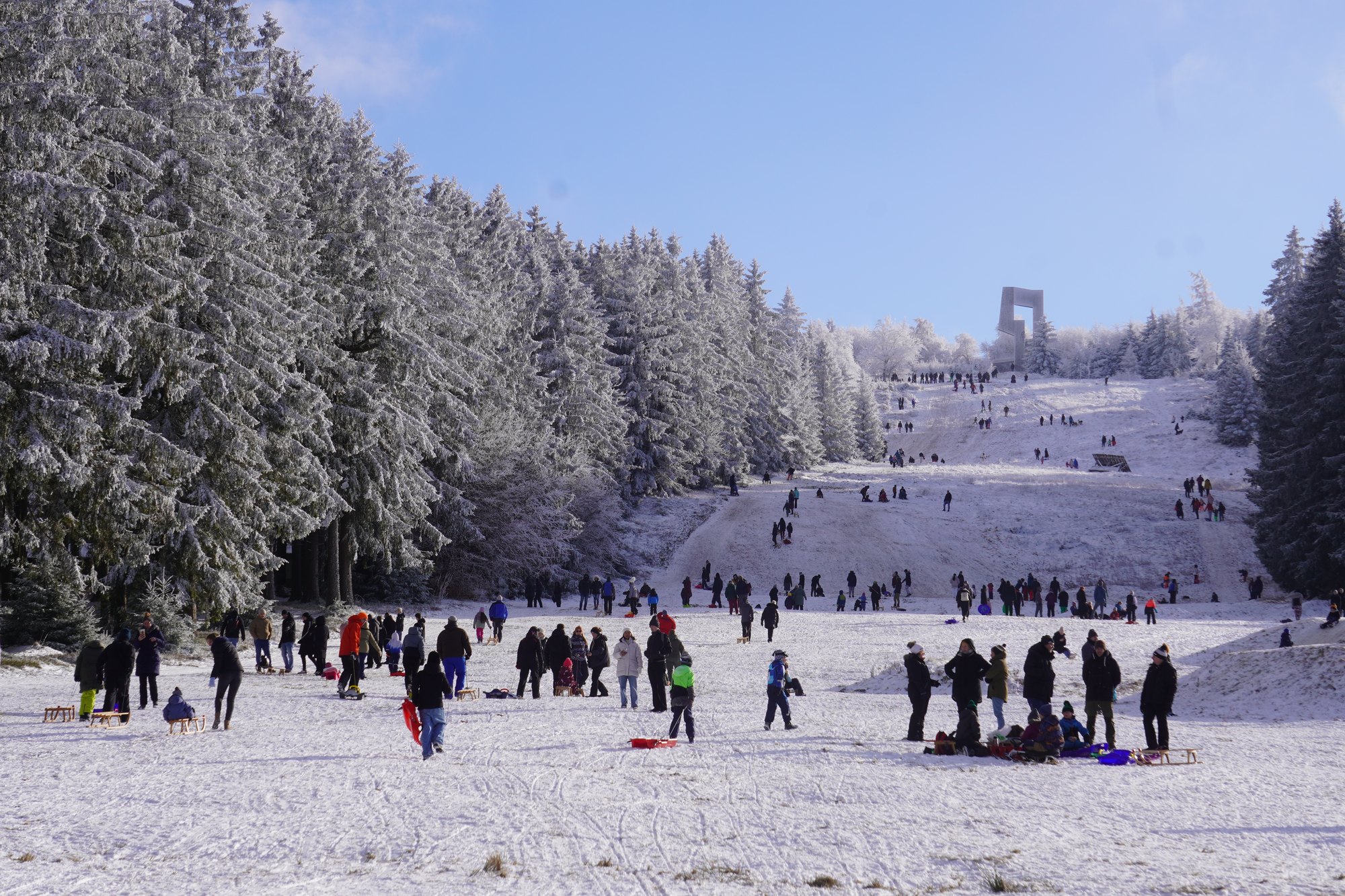 Zum Ende der Weihnachtsferien hat der Winter am Erbeskopf zahlreiche Besucher aus nah und fern angelockt. Bereits am Samstagmorgen strömten viele Menschen in die winterliche Hochwald-Region, um Schnee, Sonne und frostige Temperaturen zu genießen. Am Schlittenberg herrschte reger Betrieb: Familien, Kinder und Jugendliche rodelten fröhlich den Hang hinunter, andere erkundeten die verschneite Landschaft bei ausgedehnten Winterwanderungen.