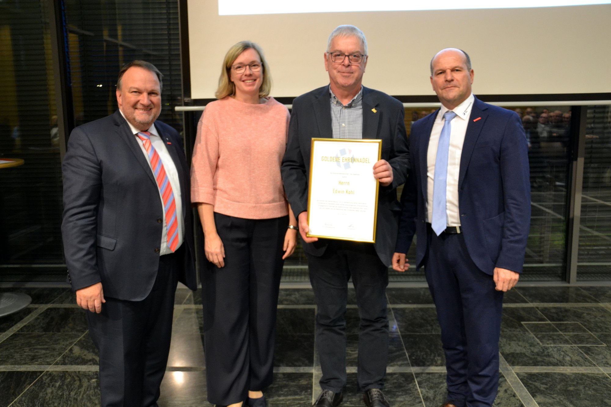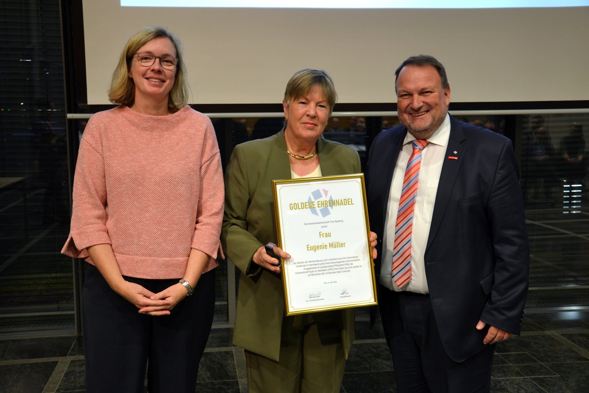 Ein zentraler Moment des Abends war die Verleihung der Goldenen Ehrennadeln der Kreishandwerkerschaft. Ausgezeichnet wurden Eugenie Müller, ehemalige Vorsitzende des Landesverbandes Rheinland-Pfalz der UnternehmerFrauen im Handwerk, Edwin Kohl, Mitglied des Prüfungsausschusses für Elektro-Maschinenbau sowie Elektronik für Energie- und Gebäudetechnik, und Michael Heinze, Lehrlingswart der Innung für Sanitär-, Heizungs- und Klimatechnik, der posthum geehrt wurde; seine Ehefrau nahm die Auszeichnung entgegen. Die Ehrungen überreichten KHS-Geschäftsführerin Isabell Felten und Kreishandwerksmeister Gerd Benzmüller.