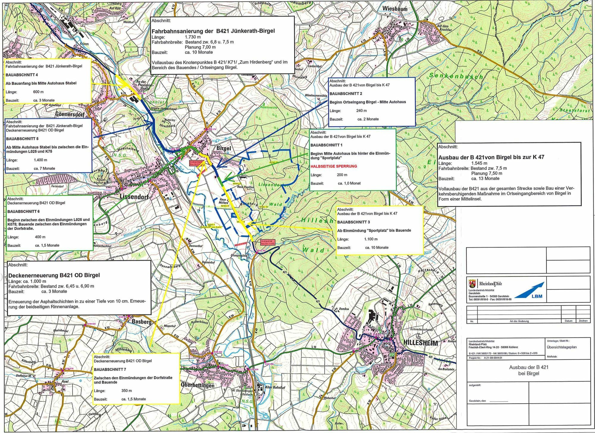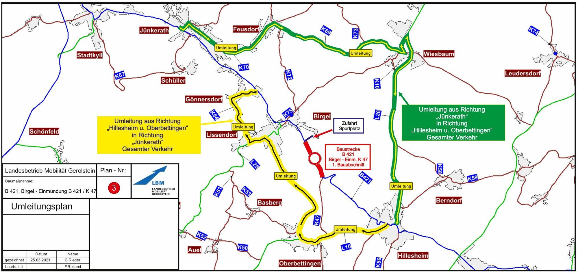 Ab dem morgigen Donnerstag, 8. April, wird die B 421 zwischen der Zufahrt zum Sportplatz bei Birgel und der Einmündung B 421 / K 47 bei der Crumpsmühle wegen Bauarbeiten vollgesperrt. Die Bauarbeiten dauern voraussichtlich bis Ende Dezember 2021. Es ist die erste Bauphase, weitere werden folgen. Deshalb wird es insgesamt auf der B 421 zwischen Jünkerath und Hillesheim nach und nach auf verschiedenen Abschnitten zu Behinderungen für den Verkehr kommen (s. neben-/untenstehendes pdf-Dokument). Die gesamte Baumaßnahme wird voraussichtlich bis Mitte 2023 laufen. Für den Abschnitt zwischen K 47 und Ortseingang Birgel, auf dem die Bauarbeiten der Gesamtmaßnahme jetzt beginnen, plant der Landesbetrieb Mobilität einen Vollausbau der B 421 sowie eine Mittelinsel am Ortseingang zur Verkehrsberuhigung (s. Übersichtskarte, Bauabschnitt 3). Innerhalb von Birgel ist eine Erneuerung der Asphaltschichten sowie der Abwasserrinnen auf beiden Seiten der Fahrbahn der Hauptstraße vorgesehen. Zwischen dem Baubeginn an der Kyll-Überquerung bei Gönnersdorf und dem Ortseingang Birgel ist ebenfalls eine Fahrbahnsanierung geplant. Außerdem soll die Kreuzung B 421 / Zum Kylltal (K 71) / Zum Hirdenberg bei Auto Stabel ausgebaut werden. Während der ersten Bauphase wird der Verkehr wie folgt umgeleitet (s. Übersichtsplan):