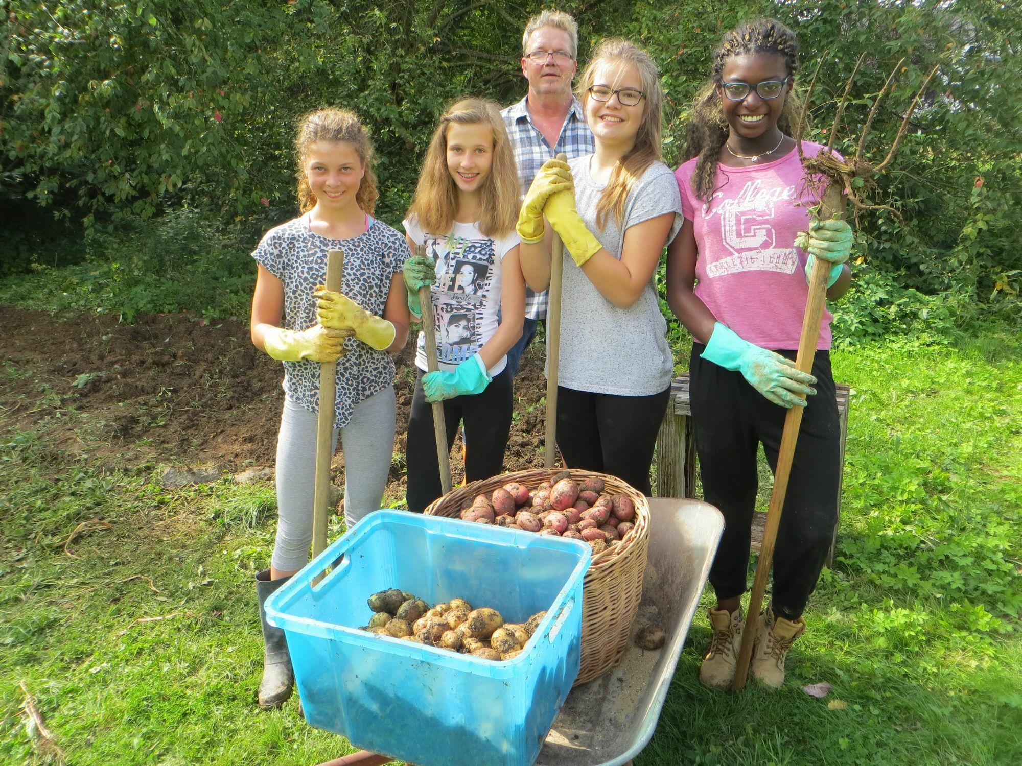 Mit diesem Projekt, das vom Deutschen Kartoffelhandelsverband (DKHV) und der landwirtschaftlichen Rentenbank gesponsert wird, soll den Kindern nicht nur das Wachsen eines Lebensmittels am Beispiel der Kartoffel gezeigt werden, sondern die Schüler sollen auch den Wert von gesunden Lebensmitteln und schmackhaftem Essen lernen. Man erhofft sich auch, dass Kartoffeln wieder mehr Platz auf dem Speiseplan der Kinder und ihrer Eltern erhalten. Am TMG legten im Frühjahr Sechstklässler mit der großzügigen und tatkräftigen Unterstützung ihres Hausmeisters Peter Marchewitz den Platz für einen Kartoffelgarten an. Danach bearbeiteten sie den Boden und pflanzten zwei Sorten von Kartoffeln, die sie vom DKHV erhalten hatten. Jetzt war es soweit: Einige Schülerinnen trafen sich mit ihrer ehemaligen Klassenlehrerin Diana Grogan-Schomers und Peter Marchewitz, um die Kartoffeln zu ernten. Nun freuen sie sich darauf, die Kartoffeln zuzubereiten und sie mit der Familie zu verspeisen.