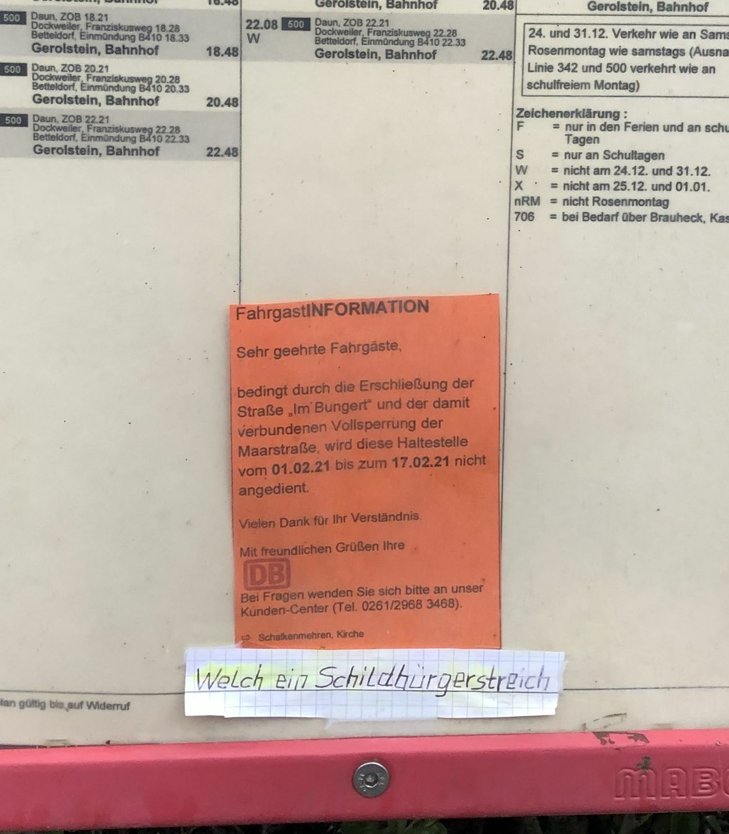Schalkenmehren (mjo). Wer Schalkenmehren mit dem Bus wollte, musste in den vergangenen Wochen einen langen Fußweg in Kauf nehmen. Die Bushaltestelle "Schalkenmehren Kirche" wurde von den Bussen der Linie 500 nicht angefahren. Hintergrund sind Bauarbeiten in der Straße "Im Bungert", die neben der Bushaltestelle in die gesperrte Maarstraße mündet, an der die Haltestelle liegt. Die Bushaltestelle selbst ist allerdings erst seit einigen Tagen direkt von den Baumaßnahmen betroffen, wurde aber bereits seit dem 1. Februar nicht mehr bedient. Wie Ortsbürgermeister Peter Hartogh auf Anfrage des WochenSpiegel erklärt, hätten Schulbusse die ausgewiesene Umleitung über "Auf dem Flur" und die St.-Martin-Straße genutzt, die Linie 500 aber nicht. "Die Kommunikation mit dem Verkehrsunternehmen war äußerst kompliziert", erläuterte er. Für Nutzer der Busse bedeutete dies, den Weg bis zu den rund 1.000 Meter entfernten benachbarten Haltestellen in Kauf zu nehmen. "Welch ein Schildbürgerstreich", befand dann auch ein Bürger. Dies steht auf einem handgeschriebenen Zettel, den jemand unter die Fahrgastinformation der DB Regio Bus Rhein-Mosel GmbH am Fahrplanaushang klebte. Der Verkehrsverbund Region Trier (VRT) erklärte gegenüber dem WochenSpiegel, dass die Planung von Umleitungen dem jeweiligen Verkehrsunternehmen obliege. "Dieses entscheidet in Abstimmung mit den zuständigen Behörden aufgrund der Vorort-Kenntnisse, ob und wo eine Umleitung notwendig ist und meldet dies dem VRT bzw. der zuständigen Kreisverwaltung. Wenn eine Umleitung eingerichtet wird, erhält der VRT zur Kundeninformation eine Baustellenmeldung vom Unternehmen, die dann wiederum veröffentlicht wird. Der Einsatz von Ersatzhaltestellen ist bei Bedarf, etwa, wenn keine naheliegende Ausweichhaltestelle erreichbar ist, möglich", so ein Pressesprecher der VRT. "Die Maarstraße wird in den kommenden Tagen halbseitig aufgerissen, um einen Wasseranschluss zu legen", so Hartogh Mitte der Woche: "Ich denke, in drei Tagen ist die Sache endlich erledigt." Am heutigen Freitag, 19. Februar, teilte ein Sprecher der DB mit, dass die Haltestelle aufgrund von Straßenbauarbeiten "für Busunternehmen bis Anfang März nicht anfahrbar" sei. "Durch die Verbandsgemeindeverwaltung wurde eine Umleitungsstrecke ausgeschildert und eine Ersatzhaltestelle errichtet, die auch die Linie 500 ab heute anfährt", so der DB-Sprecher weiter.