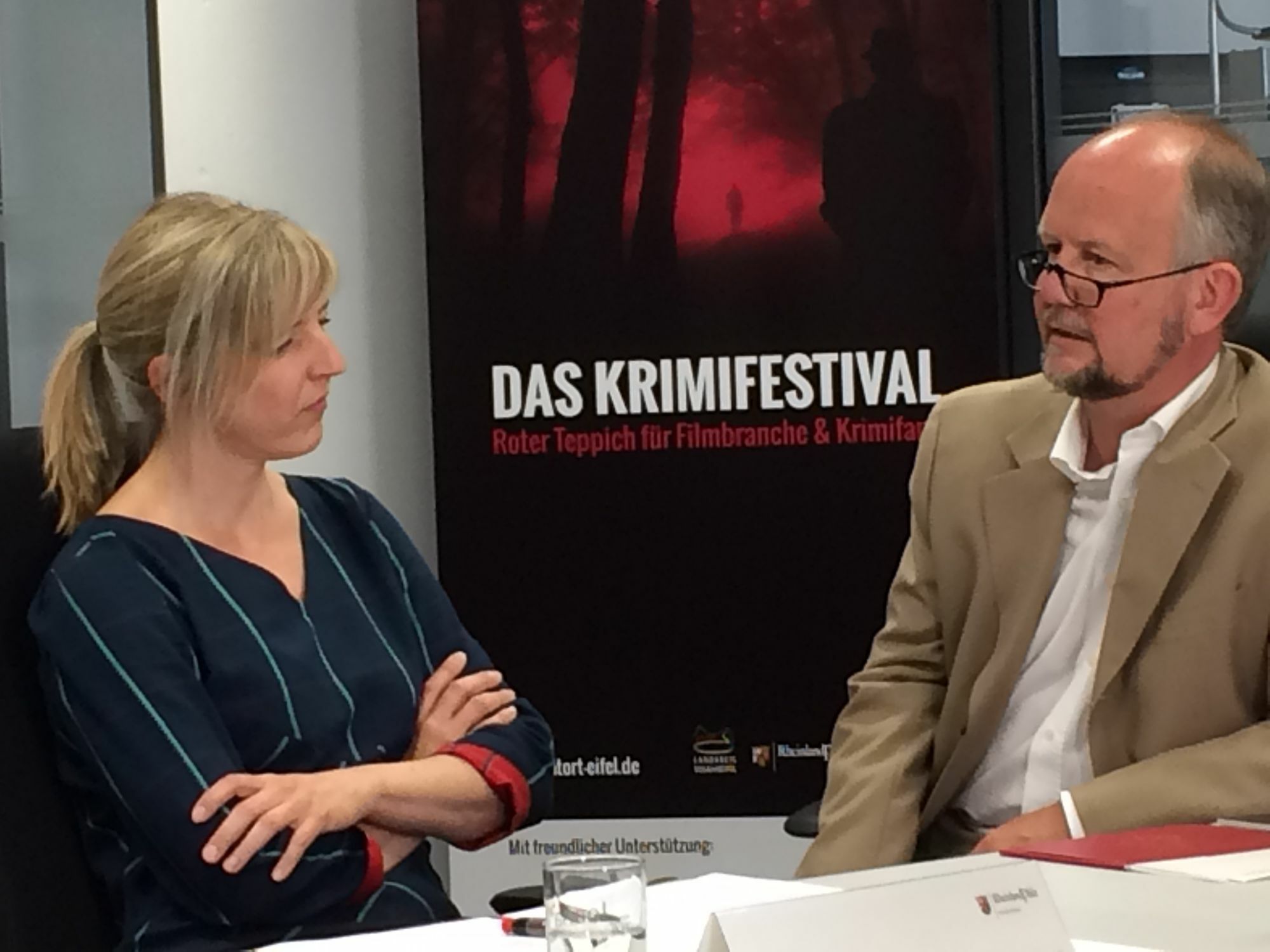 Sie feilen konspirativ am Festival-Feinschliff: Julia Röskau, Producerin für Filme und Leiterin des Fachprogramms von »Tatort Eifel«, und Verleger Ralf Kramp. Foto: A. Koch