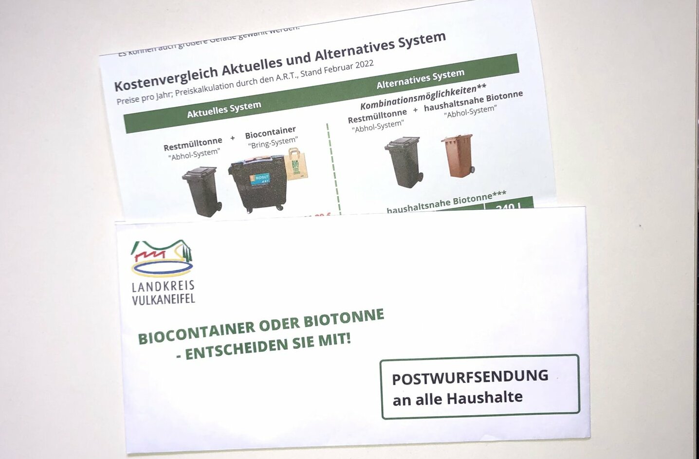 Sollte die Biotonne kommen, wird dies wohl mit Jahresbeginn 2024 geschehen. »Aufgrund der Weltlage werden sich die Gebühren bis dahin sicher noch ändern«, so Julia Gieseking. Von einer Systemumstellung profitieren würden jene, die bereits eine freiwillige 120-Liter-Biotonne vor der Tür stehen haben. Aktuell zahlen sie dafür eine Jahresgebühr von 111,25 Euro. Künftig würden ihre Gesamtgebühren niedriger ausfallen. Das trifft laut Landrätin auf rund zehn Prozent der Haushalte zu. Insgesamt gibt es im Landkreis Vulkaneifel derzeit rund 25.000 Restmüll- und 2.500 freiwillige Biotonnen. Alle Informationen werden auch auf der Internetseite www.vulkaneifel.de/buergerentscheid veröffentlicht. Weitere Fragen beantwortet die Kreisverwaltung. Unterzeichnet ist die Postwurfsendung von Landrätin Julia Giesking sowie den Vorsitzenden der Kreistagsfraktionen von CDU, SPD/UWG, FWG und FDP. Vertreter der Fraktionen waren auch am Pressegespräch beteiligt. Nicht dabei ist die Grünen-Fraktion. Diese hatte sich für eine weitergehende Informationskampagne inklusive fünf öffentlicher Infoveranstaltungen ausgesprochen.