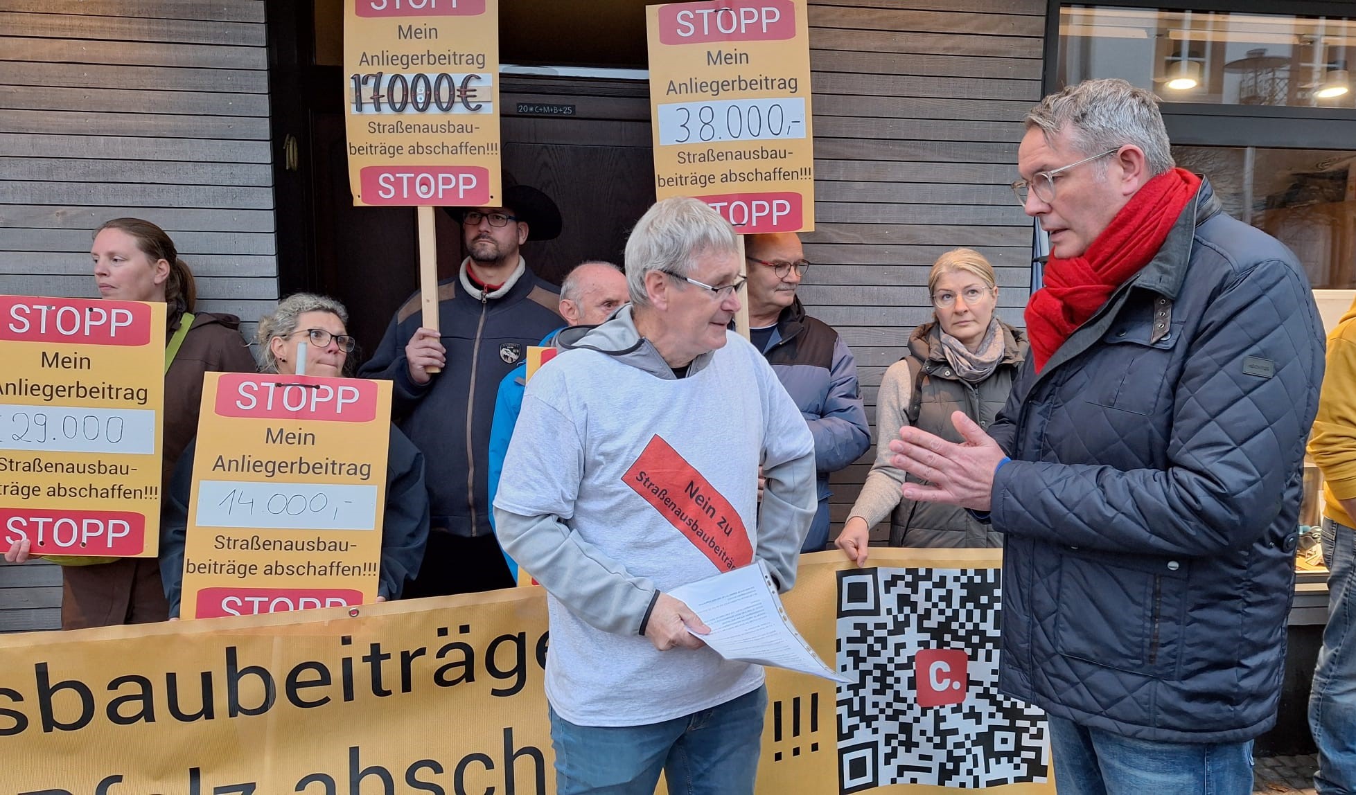 Die BI habe im Vorfeld des letzten Stopps auf der Tour »Alexander Schweitzer unterwegs« beschlossen, mit ihren Preisschildern, auf denen die aus ihrer Sicht »existenzbedrohenden« Beiträge von bis zu 80.000 Euro standen, die sie wohl die grundhafte Sanierung der Ortsdurchfahrt kosten wird, sowie zwei Bannern, auf denen sie die Abschaffung der Beiträge fordern, vor das Forum zu gehen. »Eine halbe Stunde vor dem Termin haben wir uns in einiger Entfernung vom Forum auf dem Markplatz, getroffen, als der SPD-Landtagsabgeordnete Jens Jenssen angelaufen kam. Mit hochrotem Kopf, ohne ‚Hallo‘ zu sagen oder sich den Teilnehmenden vorzustellen, hat er uns gleich angeschrien«, berichtet Merkelbach. Er vermutet, dass Jenssen gerade erfahren hatte, dass sich die Bürgerinitiative auf dem Marktplatz sammelt.