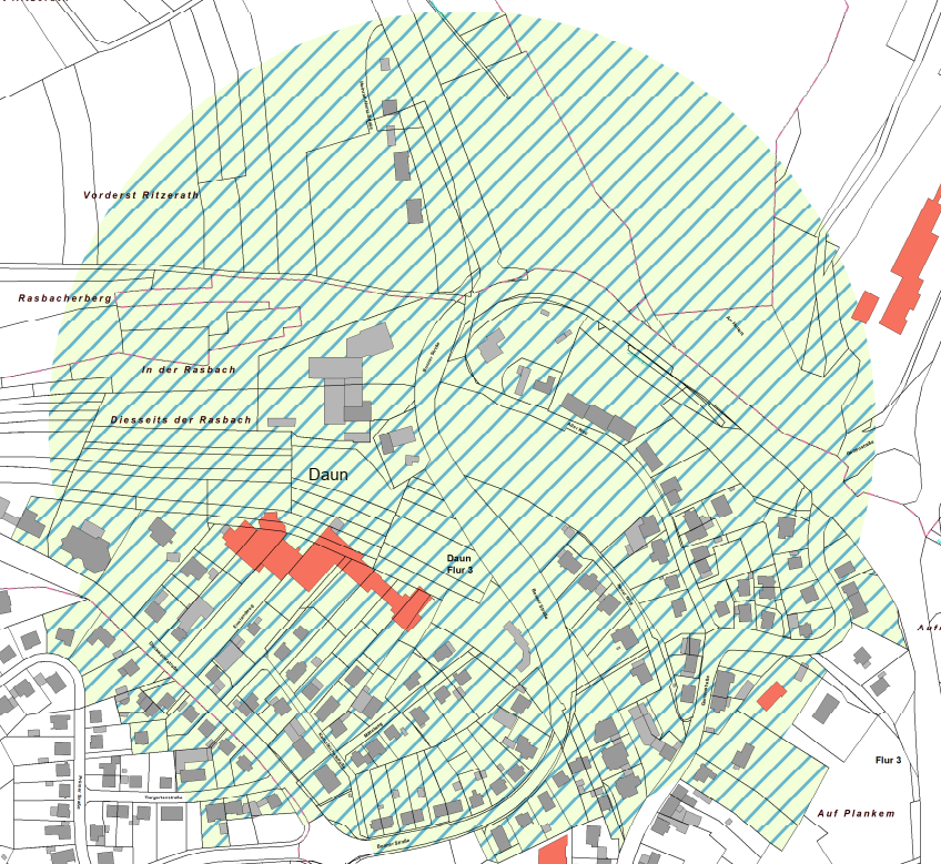 In diesem Umkreis müssen die Anwohnerinnen und Anwohner ihre Häuser am Sonntag ab 10 Uhr verlassen. Grafik: VGV Daun