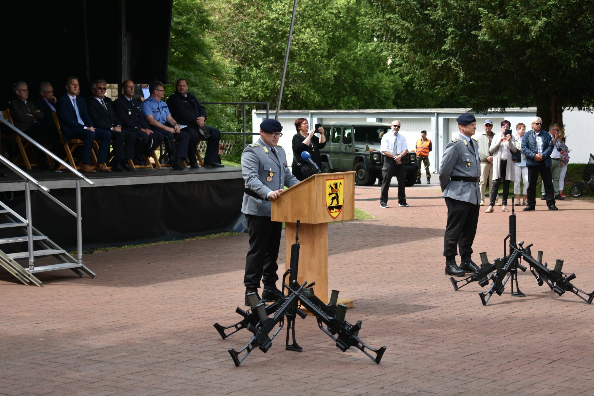 Am Donnerstag, 13. Juni, lud Oberstleutnant und Kommandeur Lars Thorsten Decker zum feierlichen Gelöbnis des Informationstechnikbataillons 281 auf den Brunnenplatz nach Gerolstein ein. In seiner Ansprache begrüßte Decker, der das Bataillon vor zwei Monaten übernahm, die zahlreich erschienenen Gäste aus Politik und Gesellschaft und nannte das feierliche Gelöbnis eine "besondere Ehre für die Soldaten". Verbandsgemeindebürgermeister Hans Peter Böffgen sprach in seiner Begrüßung von einem "ganz besonderen Ereignis" für ihn und stellte den Dienst der Bundeswehr für die Region, aber auch für die Demokratie als Ganzes, in den Vordergrund. "Die Soldaten leisten einen Dienst für unser Land und für uns alle", so Böffgen, denn Frieden und Freiheit seien nicht selbstverständlich. Musikalisch begleitet wurde das Gelöbnis vom Heeresmusikkorps Koblenz unter der Leitung von Oberstleutnant Alexandra Schütz-Knospe. Alle, die mehr von der Arbeit des Bataillons erfahren möchten, können sich den 22. September in ihren Kalendern markieren, denn dann veranstaltet das Informationstechnikbataillon in Gerolstein einen Tag der offenen Tür mit abwechslungsreichem Programm für Groß und Klein.
