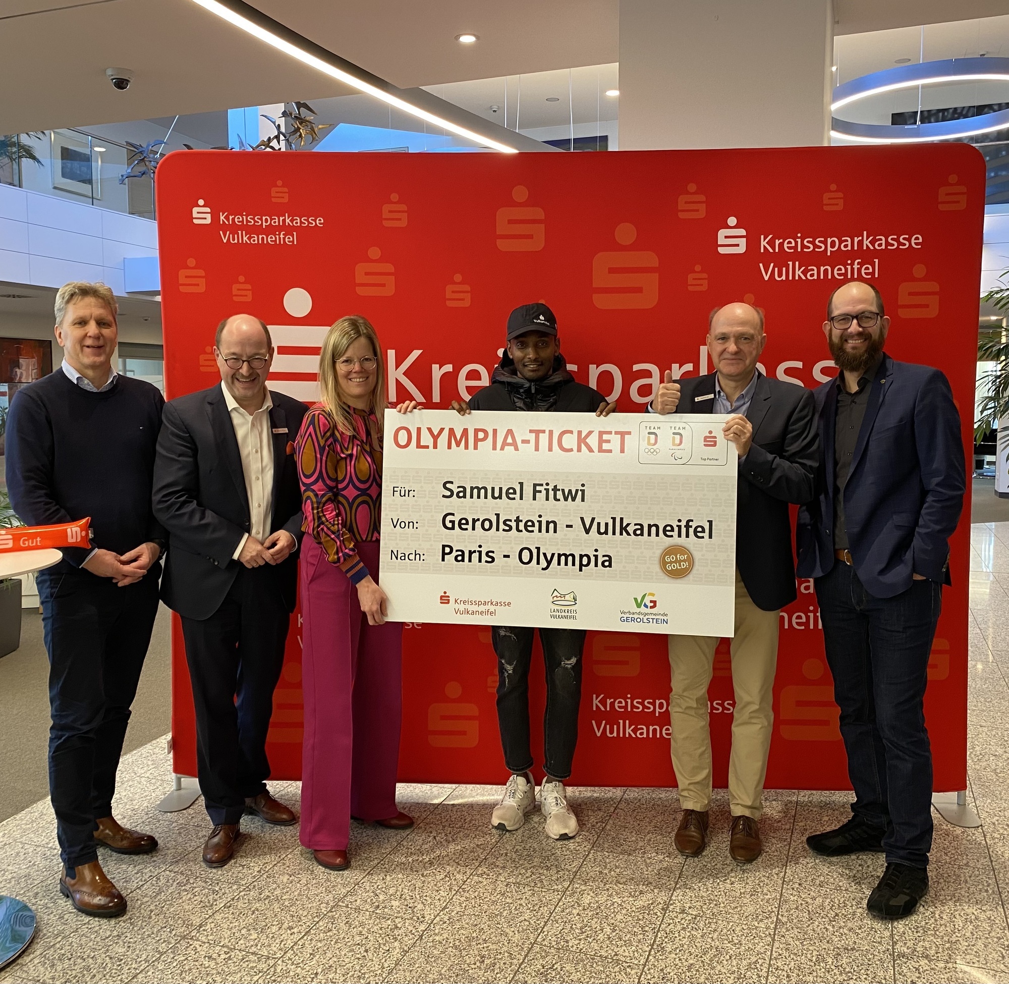 Für diese tolle Leistung hat die Kreissparkasse Vulkaneifel, als einer seiner Hauptsponsoren, Samuel Fitwi nach seiner Heimkehr aus Dubai einen herzlichen Empfang bereitet. Mit dabei waren Freunde, Förderer, Sponsoren und Pressevertreter. Dietmar Pitzen, Vorstandsvorsitzender der KSK, zeigte sich sehr gerührt und gratulierte Samuel Fitwi zu seiner Weltklasse-Leistung. »Mit unserem Sponsoring wollten wir dazu beitragen, dass auch ein talentierter Sportler aus einer ländlichen Region wie der unseren, den Weg zu Olympia schaffen kann.« Für den Landkreis Vulkaneifel gratulierte ihm Landrätin Julia Gieseking. Bürgermeister Hans-Peter Böffgen erinnerte als Vorsitzender des SV Gerolstein an die läuferischen Anfänge von Samuel Fitwi bei der LG Vulkaneifel. Dass jetzt das Olympiaticket gelöst wurde, sei einfach traumhaft.