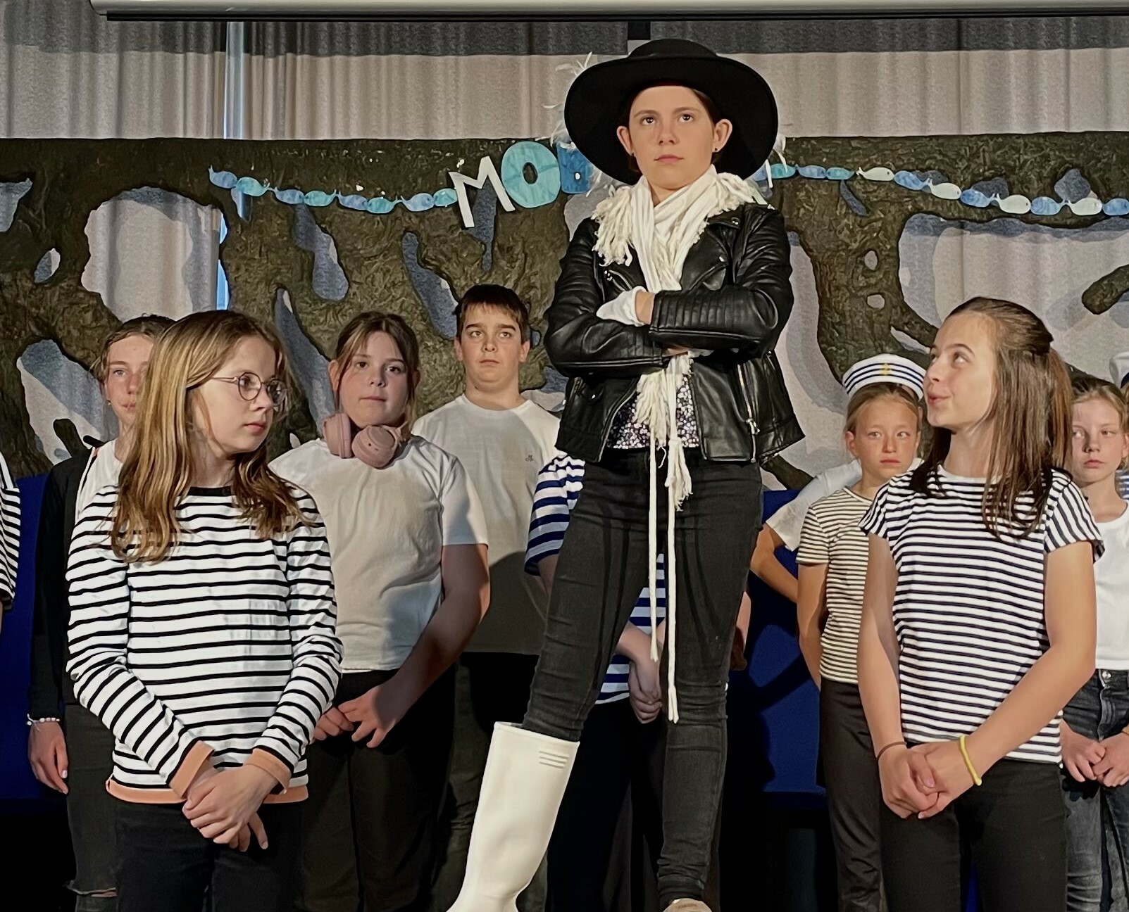 Ein toller Trailer (aktuell noch zu sehen unter: https://gsg-daun.de/2023/05/16/die-drama-lamas-praesentieren/) hat bereits Wochen zuvor die Spannung steigen lassen - und am 25.05. war es dann endlich soweit. Bei der Premiere in der Aula des Geschwister-Scholl-Gymnasiums Daun war kaum noch ein Platz zu ergattern: Die Theater-AG der Unterstufe zeigte das Stück: "Moby Dick oder die Qual des Wals", von Christian Holm, nach dem weltbekannten Roman von Hermann Melville. Eine Gruppe junger Menschen wird von Käpt'n Ahab als Crew angeheuert, um mit ihm den unbesiegbaren weißen Wal Moby Dick ausfindig zu machen. Ahab hat es sich zur Lebensaufgabe gemacht, sich an Moby Dick zu rächen und ihn zu töten, weil dieser ihm einst bei der grausamen Waljagd ein Bein abriss. Eine wilde Seefahrt beginnt. Nach und nach fragt man sich zusammen mit den jungen Seeleuten: Wem oder was jage ich hinterher in meinem Leben? Wofür würde ich alles aufgeben? Wonach würde ich mich zurücksehnen? Darf ich dieses Tier töten? - Das Spiel der 30 Jungen und Mädchen aus den 5. und 6. Klassen des GSG, die sich selbst die "Drama Lamas" nennen, war von dem ersten Auftritt an mitreißend.