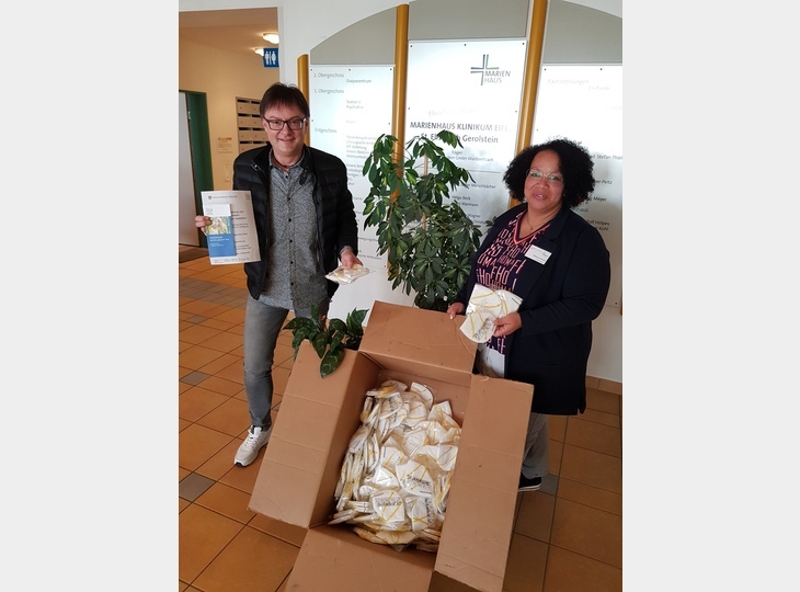 Am vergangenen Dienstag, 31. März, lieferte ein Lastwagen vier Paletten Getränke an das St. Elisabeth-Krankenhaus in Gerolstein. Die 192 Kisten mit Sprudelwasser, Apfelschorle und Orangenlimonade waren eine Spende der Gerolsteiner Brunnen GmbH & Co.KG für die Mitarbeiterinnen und Mitarbeiter. „Wir erfahren zurzeit eine große Welle der Solidarität mit unseren Ärzten, Pflegekräften und allen, die die Patienten versorgen“, freuen sich Krankenhausoberin Katharina Schmitt und Wolfgang Meyer. Der Vorsitzende des Förderkreises des St. Elisabeth-Krankenhauses pflegt schon seit Jahren einen guten Kontakt zu dem Unternehmen, das auch in der Vergangenheit das St. Elisabeth-Krankenhaus schon mit großzügigen Spenden unterstützt hat. Am heutigen Donnerstag folgte dann eine weitere wichtige Spende. Rainer Leuer, Stabsmitarbeiter des Verwaltungsstab Corona von der Kreisverwaltung Vulkaneifel, übergab 380 FFP2-Schutzmasken an Krankenhausoberin Katharina Schmitt. Es handelt sich hierbei um dicht anliegende spezielle Schutzmasken, die den Träger vor Viren schützen. Diese Atemschutzmasken filtern kleinste Partikel und Tröpfchen zuverlässig aus der Luft. "Ich bedanke mich sehr herzlich - auch im Namen unserer Mitarbeiterinnen und Mitarbeiter - für Ihre großzügige Spende", so Katharina Schmitt.