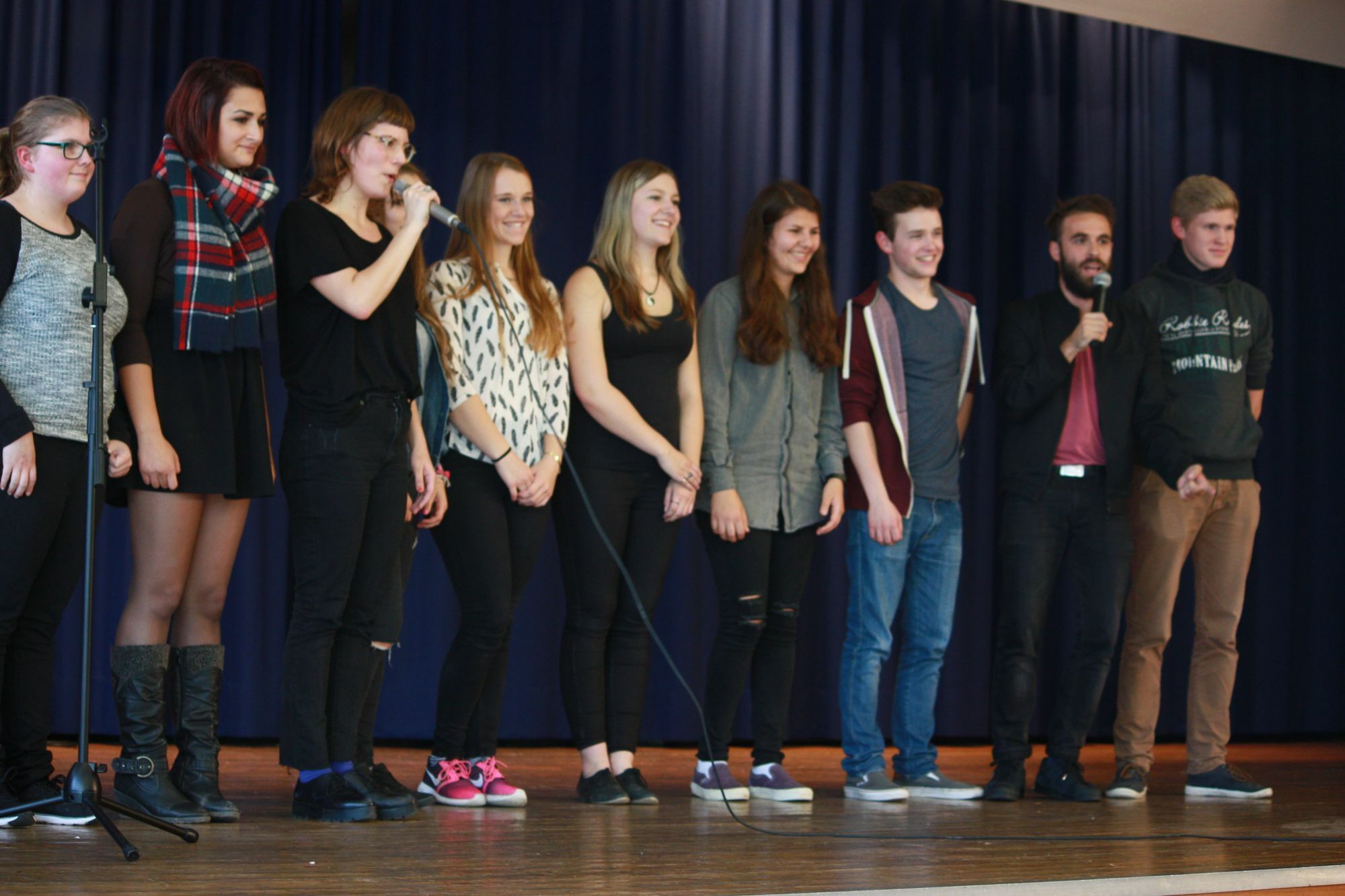 "Nicht mit uns – Kreativ und aktiv gegen Gewalt mit Sprache und Medien", unter diesem Motto fand im Rahmen des Krimifestivals „Tatort Eifel“ ein Poetry-Slam-Workshop im Haus der Jugend in Gerolstein statt. Das Kreisjugendamt und die Kreisbibliothek Vulkaneifel hatten in Kooperation mit dem Haus der Jugend Gerolstein Schülerinnen und Schüler zu einem Poetry-Slam-Workshop eingeladen. Acht Schülerinnen und Schüler vom St. Matthias-Gymnasium und von der Realschule plus in Gerolstein fühlten sich angesprochen und kreierten zusammen mit den Poetry-Slam-Workshopleitern Svenja Gräfen und Philipp Herold poetische Texte. Nach einer Einführung und Bekanntgabe der Spielregeln und der Gestaltungstechniken von Poetry Slams wurde diskutiert, gedichtet, geschrieben und das Vortragen der Texte geübt. Ein Medienteam von sieben Schülern begleitete die „Dichter und Denker“ mit Kameras und Mikrofon. Unter großem Zeitdruck wurde ein viereinhalbminütiger Dokumentationsfilm produziert. Die Teilnehmer der Workshops präsentierten ihre poetischen Werke vor öffentlichem Publikum auf der Bühne in der Aula des St. Matthias-Gymnasiums. Im Anschluss zeigte das Medienteam seinen Kurzfilm. Alle Akteure erhielten viel Beifall für ihre Werke. Die Veranstaltung wurde von der Big Band des St. Matthias-Gymnasiums musikalisch mitgestaltet. Ein Team des SWR Fernsehen begleitete den Workshop. Am 3. Oktober werden 20.15 Uhr Ausschnitte im SWR Fernsehen in dem Film „Daheim in der Eifel“ zu sehen sein.