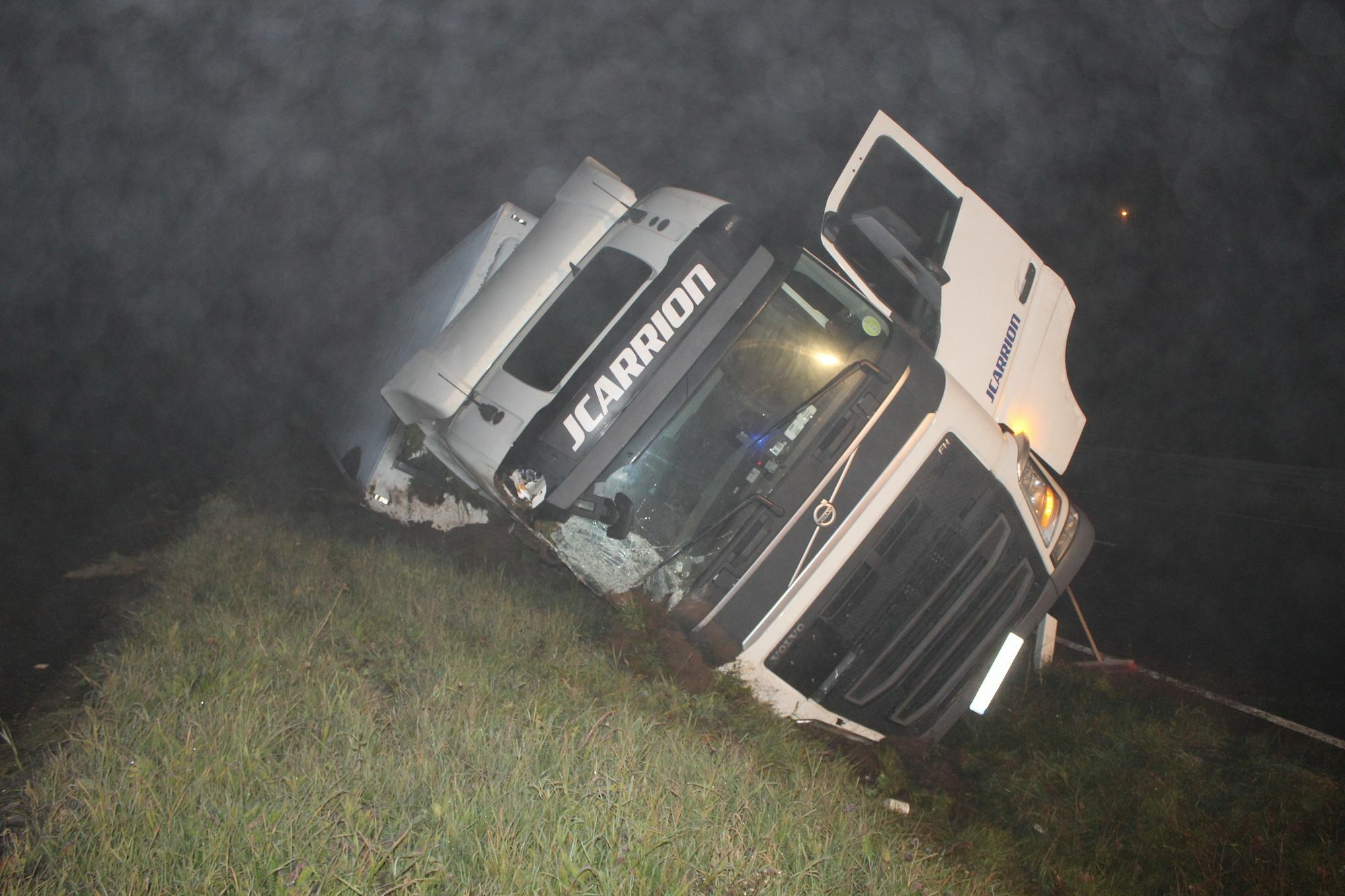Am Dienstag, 14. November, gegen 4.10 Uhr, ereignete sich im zweispurigen Bereich auf der B 51 bei Stadtkyll ein Verkehrsunfall, bei dem ein Sattelzug von der Fahrbahn abkam. Der Fahrer des rumänischen Sattelzuges, der aus Richtung Köln kommend unterwegs war, hatte vermutlich infolge der den witterungsbedingten Fahrbahnverhältnissen (Glatteis) nicht angepassten Geschwindigkeit die Kontrolle über sein Fahrzeug verloren. Er geriet nach rechts von der Fahrbahn ab und kam parallel zur Fahrbahn auf der rechten Fahrzeugseite liegend zum Stillstand. Da zunächst die Vermutung bestand, das Fahrzeug verliere Kraftstoff wurde die Feuerwehr hinzugezogen, die die Tanks leerpumpte. Die Bergung des Fahrzeuges wurde auf den frühen Nachmittag festgesetzt. Der Verkehr wird derzeit einstreifig an der Unfallstelle vorbeigeführt. Die Bergungsmaßnahmen sollen bis circa 15 Uhr andauern.