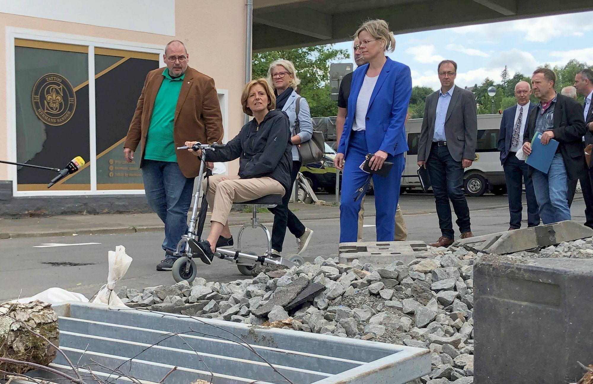 Bei einem Rundgang durch Gerolstein hat sich Ministerpräsidentin Malu Dreyer heute Nachmittag ein Bild von der Situation rund zwei Wochen nach der Hochwasserkatastrophe gemacht. Vom Rondell aus ließ sie sich von Stadtbürgermeister Uwe Schneider bis zum Kyllpark und dem Bahnhof führen. Begleitet wurden sie unter anderem von Landrätin Julia Gieseking, Beigeordneter der VG Gerolstein Klaus-Dieter Peters, den Landtagsmitgliedern Astrid Schmitt (SPD) und Marco Weber (FDP), der Vorstandsvorsitzende der Kreissparkasse Vulkaneifel Dietmar Pitzen, Brand- und Katastropheninspektor Harald Schmitz sowie weitere Vertreter von Rettungs- und Hilfsorganisationen. Schneider berichtete der Ministerpräsidentin, wie die Lage vor rund zwei Wochen aussah. Spontan betrat Dreyer die Buchhandlung Raabe und informierte sich bei Inhaberin Leslie Raabe zur Situation. "Hier die Ecke war so ein kleines Inselchen", berichtete die Buchhändlerin, deren Geschäft von den Fluten verschont blieb. Allerdings wurde das Lager im Keller stark beschädigt. Auch im Fachgeschäft Eul erkundigte sich die Ministerpräsidentin, ganz begeistert von der Auswahl des Ladens, über die Situation. "Man hat eine Existenz aufgebaut und will das gerne noch ein paar Jahre machen, weil es einem auch Spaß macht - und dann kommt sowas"; so Rosi Eul: "Erst mal denkt man: Jetzt ist es vorbei. Dann sieht man aber, dass es weitergeht." Vor allem durch die Hilfe vieler Freunde habe man das Geschäft schnell wieder öffnen können. Da sich die Kyll direkt in Blickweite befindet, sahen sie das Wasser steigen und hatten deshalb bereits nachmittags zu dritt begonnen, das Geschäft auszuräumen. Großes Interesse zeigten die Gieseking, Schneider und Schmitt vor allem daran, wie es mit der Eifelstrecke weitergeht. Vor Ort trafen sie auf eine Delegation der Deutschen Bahn, allen voran den Konzernbevollmächtigten Dr. Klaus Vornhusen und Gerd-Dietrich Bolte, Leiter Infrastrukturprojekte Region Mitte. Ab nächster Woche wird Gerolstein durch einen Zubringerbus an den Expressbus des Schienenersatzverkehrs zwischen Trier, Euskirchen und Köln angebunden. "Aber das kann die Bahn natürlich nicht ersetzen. Wir brauchen die Bahn", betonte die Landrätin. Aussagen zu Zeiträumen der Wiederherstellung der Strecke gaben die Vertreter der DB auch auf Nachfrage nicht. Das größte Problem sei die Stellwerkstechnik. "Es ist unser Bestreben, zukunftsfähige, elektronische Stellwerkstechnik einzubauen - zumal für die alte Technik nicht genug Ersatzteile da sind, das muss man ganz klar sagen", erklärte Bolte: "Das wird noch den größten Zeitraum einnehmen, glaube ich." Ein weiteres Thema seien die Brücken. "Das ist im Ahrtal ganz schlimm. Aber auch hier gibt es Brücken, bei denen man sagen muss, dass sie sicherlich keinen Zug mehr tragen werden", sagte Vornhusen mit Blick auf die Vulkaneifel. Unter anderem müsse man schauen, ob man temporär mit Hilfsbrücken arbeiten könne. Im Ahrtal würden möglicherweise nicht alle Brücken wieder genauso aufgebaut wie ursprünglich, vermutete Vornhusen. Es müsse geprüft werden, ob bei manchen Brücken ein abweichender Aufbau Sinn mache. Vornhusen mahnte: "Man kann da aber nicht auf ein langes Planungsrecht warten." Ähnliches gelte für die üblicherweise weitreichenden Vergabeverfahren für die Bauleistungen. "Wir müssen Sonderregelungen im Vergabeverfahren haben. Sonst dauert das sechs bis acht Monate", betonte er und erhielt dafür die Zustimmung der Ministerpräsidentin. Bei langen Strecken gebe es Überlegungen, gewisse Teilstücke bereits vorher wieder in Betrieb zu nehmen, so Bolte. Welche Möglichkeiten und Betriebsverfahren dort möglich seien, müsse in den nächsten Tagen entschieden werden. "Ich rede dabei nicht von Wochen", betonte Bolte.