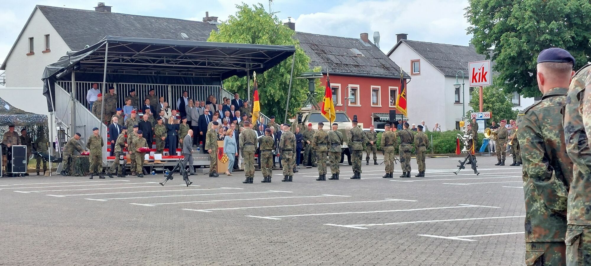 Am Freitag, 30. Juni, hat die Ministerpräsidentin des Landes Rheinland-Pfalz, Malu Dreyer, im Rahmen eines öffentlichen Appells dem hiesigen Kommando "Aufklärung und Wirkung" auf dem Marktplatz in Daun das "Fahnenband der Ministerpräsidentin" verliehen. Musikalisch wurde das Ereignis vom Heeresmusikkorps aus Koblenz begleitet. Gespielt wurde vor einem Marsch und der Nationalhymne das Stück "Ich hatte einen Kameraden" - zum Gedenken an jene Soldaten aus Daun, die bei ihrem Auslandseinsatz in Kabul infolge eines Selbstmordattentates zu Tode gekommen waren. Gut 150 Menschen aus Daun konnten dem Ereignis nur aus der Ferne zuschauen, da der Marktplatz durch Bundeswehrsoldaten und Polizisten abgeriegelt war. Nachdem in den frühen Morgenstunden die Bundeswehr auf dem Dauner Marktplatz die Tribüne aufgebaut hatte, wurden die Zufahrten zum Markplatz mithilfe von Bundeswehrfahrzeugen gesperrt. Im Vorfeld der Veranstaltung haben Polizisten mit Hilfe von Bombenspürhunden den Platz untersucht.
