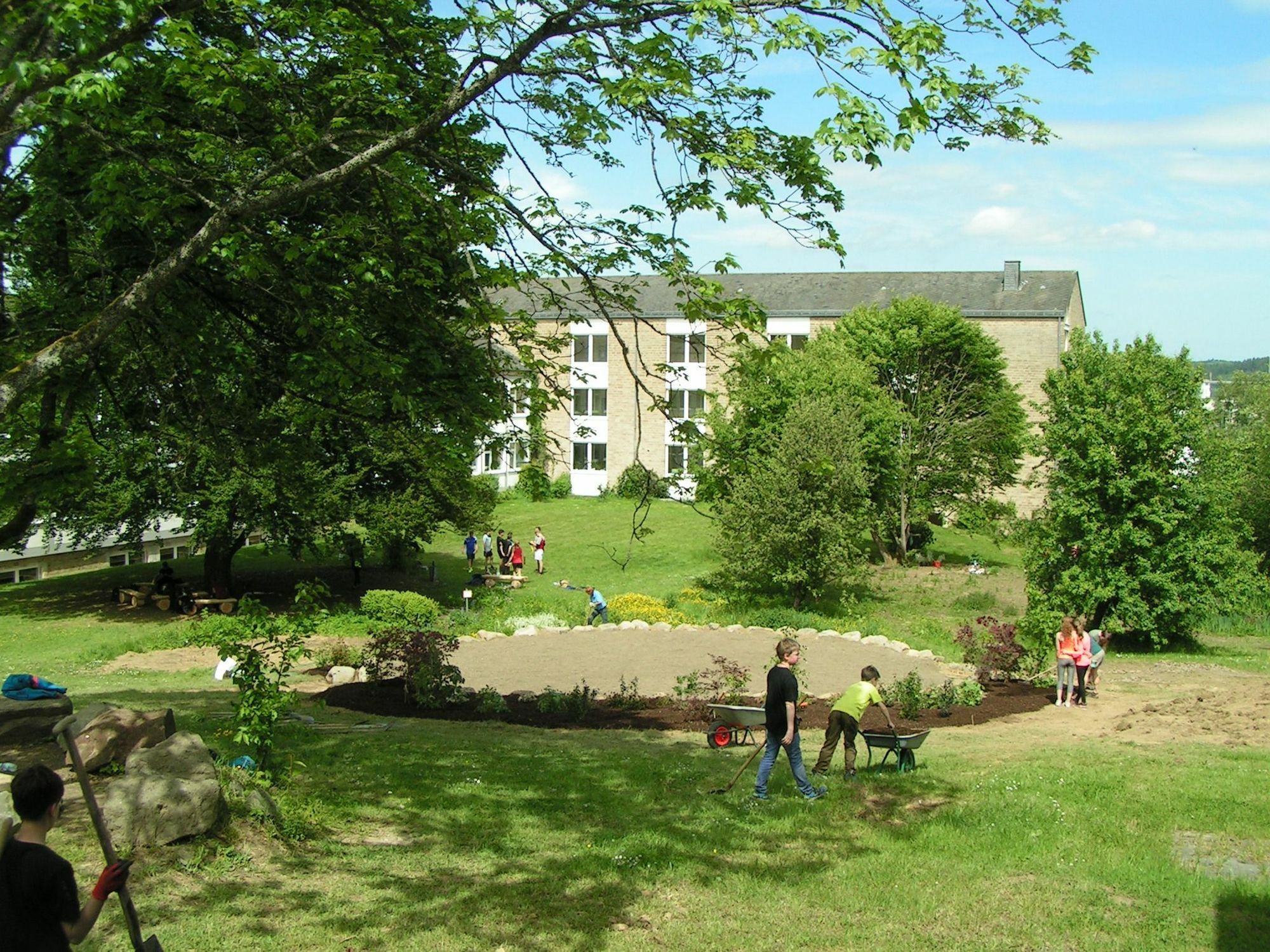 Vom Schulträger genehmigt, rückte im Sommer »schweres Gerät« an, um die notwendigen Erdbewegungen für eine kreisrunde Fläche mit 12 m Durchmesser im Zentrum des Schulgartens durchzuführen und den Boden zu verdichten. Begrenzt wurde dieses Rondell mit schweren Basalt-Findlingen, die für Abgrenzung und Stabilität sorgen. Das Verdichten der Fläche und Aufbringen der feinkörnigen Lava erledigten fleißige Schülerhände im Rahmen der diesjährigen Projekttage. Diese wurden auch genutzt, um eine Vielzahl von Sträuchern und Pflanzen unter fachkundiger Anleitung der Biologinnen der Schule oberhalb des geschaffenen Rondells zu setzen. Trotz der Hitzeperiode in diesem Jahr ist alles angewachsen. Wenn die Witterung es zulässt, wird in den nächsten Tagen mit Hilfe fachkundiger Eltern, Lehrer und Unterstützung von Schülern der Platz gepflastert. Dann steht der umfassenden Nutzung im nächsten Jahr nichts mehr im Wege, denn entsprechendes solides und wetterfeste Tische, Bänke und eine bewegliche Tafel sind angeschafft und warten darauf, aufgestellt zu werden. Eine offizielle Einweihungsfeier im Frühjahr wird dann der Startschuss für eine vielfältige Nutzung dieses Platzes sein. Das Projekt wurde unter der Schirmherrschaft des Freundeskreises des TMG geplant und realisiert. An der Finanzierung beteiligten sich die Firmen Gerolsteiner (Wettbewerb »Team mit Stern«), RWE vor Ort sowie die Westeifel Werke mit großzügigen Geld und Sachspenden, weiterhin die Kreissparkasse Vulkaneifel und die Volksbank RheinAhrEifel sowie eine Vielzahl von Eltern, Lehrern und Ehemaligen des Thomas-Morus-Gymnasiums. Ihnen danken der Freundeskreis und die Schule.