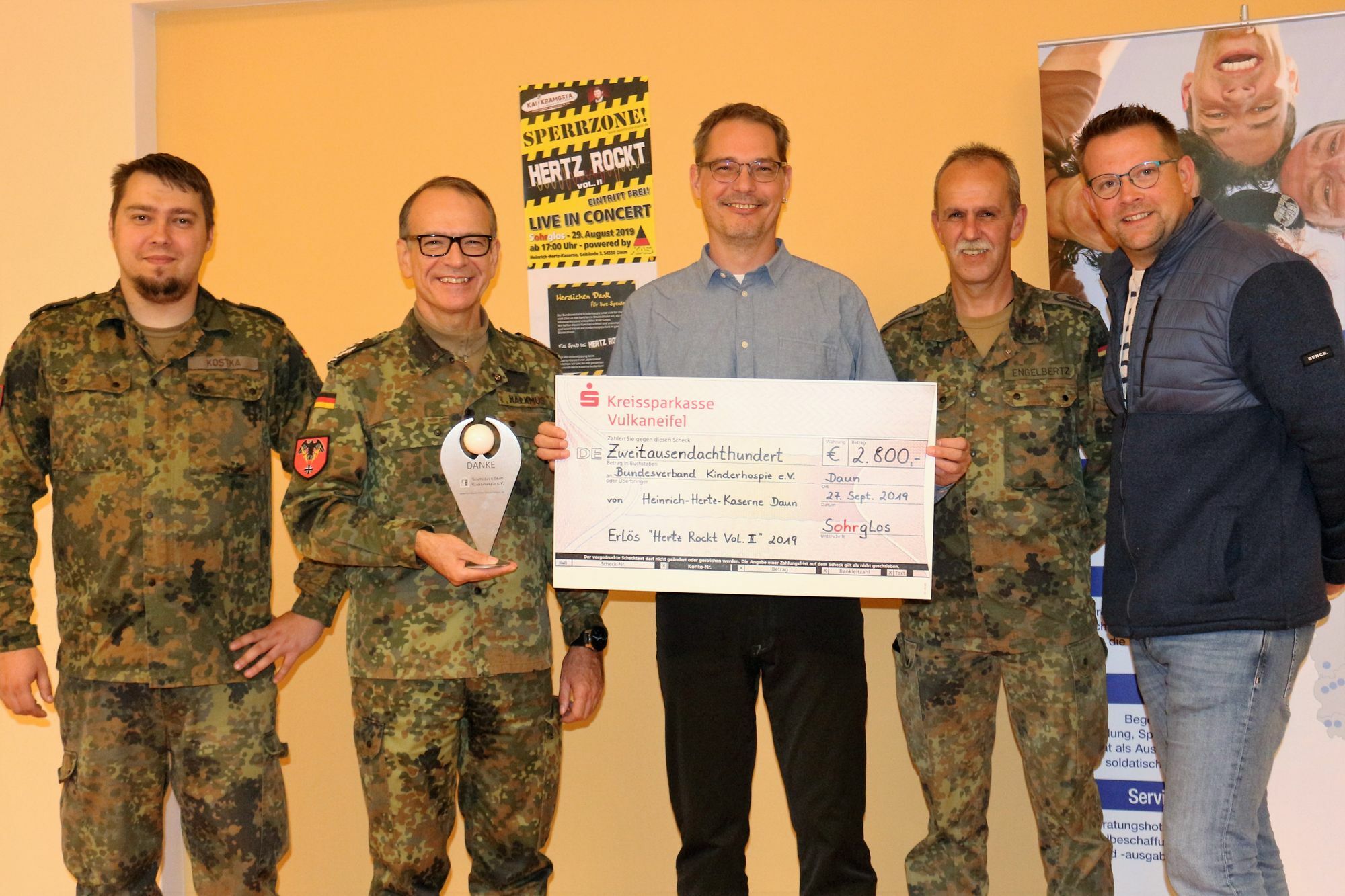 Zum zweiten Mal führte die Dauner Heinrich-Hertz-Kaserne, mit ihrer über die Eifelregion hinaus bekannten Standortband »Sperrzone«, für alle Angehörigen der am Standort ansässigen Dienststellen und Einheiten ein Open-Air-Konzert unter dem Motto »Hertz rockt« für einen guten Zweck durch. Nicht nur das kameradschaftliche Zusammensein stand im Vordergrund, sondern auch Wohltätigkeit. Daher wurde der Erlös in diesem Jahr dem Bundesverband Kinderhospiz e.V. in Lenzkirch gespendet. So überreichte Oberst i. G. Uwe Malkmus zusammen mit den Organisatoren einen Spendenscheck in Höhe von 2.800 Euro an Per Toussaint, der als Vertreter des Bundesverbandes Kinderhospiz e.V. vor Ort war.